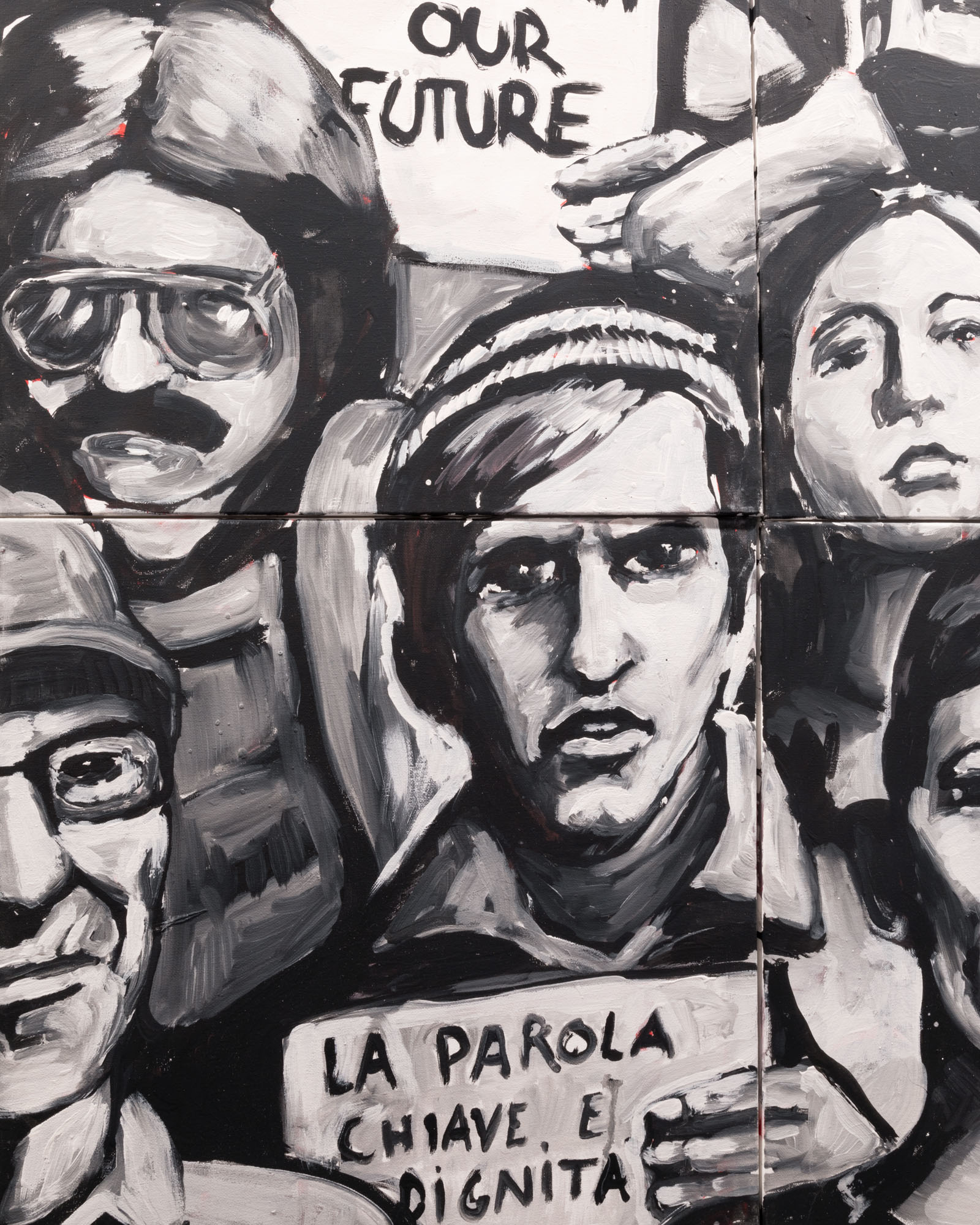 Raffaella Perna: ce ne sono diversi, naturalmente…alcuni sono legati a una cosa che m’ha sempre un po’ colpito di Lucia Marcucci: il fatto che avesse una precocissima sensibilità, per ciò che riguarda l’Italia, soprattutto la coscienza ecologica. Ci sono delle sue tele emulsionate in cui compare questa parola “ecologia” nei primissimi anni 70, anche questo insomma il nesso tra la donna e la terra, lo sfruttamento della donna connesso allo sfruttamento del pianeta è un tema, secondo me, molto attuale e in qualche modo che lei ha trattato e affrontato in tempi appunto in cui questo tipo di di contenuti non erano così usuali, soprattutto in maniera così esplicita non erano usuali, all’interno della scena artistica italiana. Ci sono naturalmente altri esempi però, sicuramente, questo aspetto e questa sua capacità di capire e di legare lo sfruttamento di genere su tendenza familiare con quello della terra è secondo me un aspetto importante. Poi ci sono anche altri lavori, a me interessano molto, per esempio, dei suoi lavori forse meno noti rispetto ai collage che consiste in questa serie di impronte del corpo che lei ha fatto nel 78 e che ha esposto, tra l’altro, nella mostra “Materializzazione del linguaggio” curata da Mirella Bentivoglio che, negli ultimi anni, è stata oggetto di un grande rivalutazione. Era una mostra nel 78 che era stata fatta e voluta perché ci si era accorti che la presenza femminile nella rassegna della Biennale di quell’anno era bassissima… si correva il rischio di andare allo scontro con le femministe che, all’epoca, erano vigorose: avrebbero presumibilmente protestato e per riuscire ad arginare il problema, in maniera un po’ strumentale, si apre questa questa mostra. Tuttavia la si apre due mesi dopo l’apertura della Biennale del 78, quindi, in una posizione cronologicamente defilata e anche logisticamente defilata e con pochi mezzi. Mirella Bentivoglio, all’epoca, grazie alla sua rete estremamente capillare di rapporti con poetesse visive di tutto il mondo riesce a metter su una mostra importante. All’epoca, bisogna dirlo, non ebbe questo grande successo, mentre negli ultimi anni è stata veramente oggetto di letture critiche e di mostre. In quell’occasione, Lucia Marcucci presentò questa serie di impronte con il corpo che fanno un po’ il verso a Yves Klein, sono un po’ una parodia delle impronte delle “Antropometrie” di Klein, però, in questo caso, il corpo non è più quello di modelle nude che agiscono come pennelli umani, ma si tratta di un corpo vissuto, agito dall’artista e messo in contrapposizione con parole legate alla cultura patriarcale o anche al marxismo. Ecco perché un’altra delle questioni centrali in quegli anni, pensiamo alle riflessioni su Hegel di Carla Lonzi, è proprio quella di non vincolare la lotta delle donne soltanto all’interno della lotta politica più generale portata avanti dalla sinistra italiana, insomma, quella di scorporarla, o meglio, di cercare di capire quella che è la specificità della lotta di liberazione delle donne. Quelle opere di Lucia Marcucci, secondo me, sono opere interessanti anche perché pongono proprio in dialettica, in tensione, questa corporeità così primaria, così primigenia con idee e concetti legati alla cultura patriarcale.