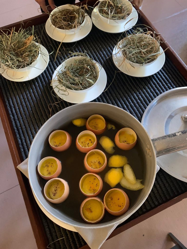 A seguire dei piccoli nidi su cui poggia un guscio aperto a metà, con all’interno un tuorlo d’uovo servito crudo, dentro cui viene versato brodo, un filo d’olio, pepe, sale. Il calore del liquido lo cuoce leggermente.