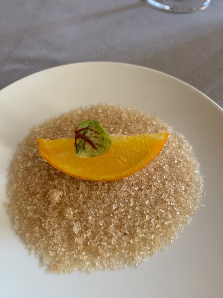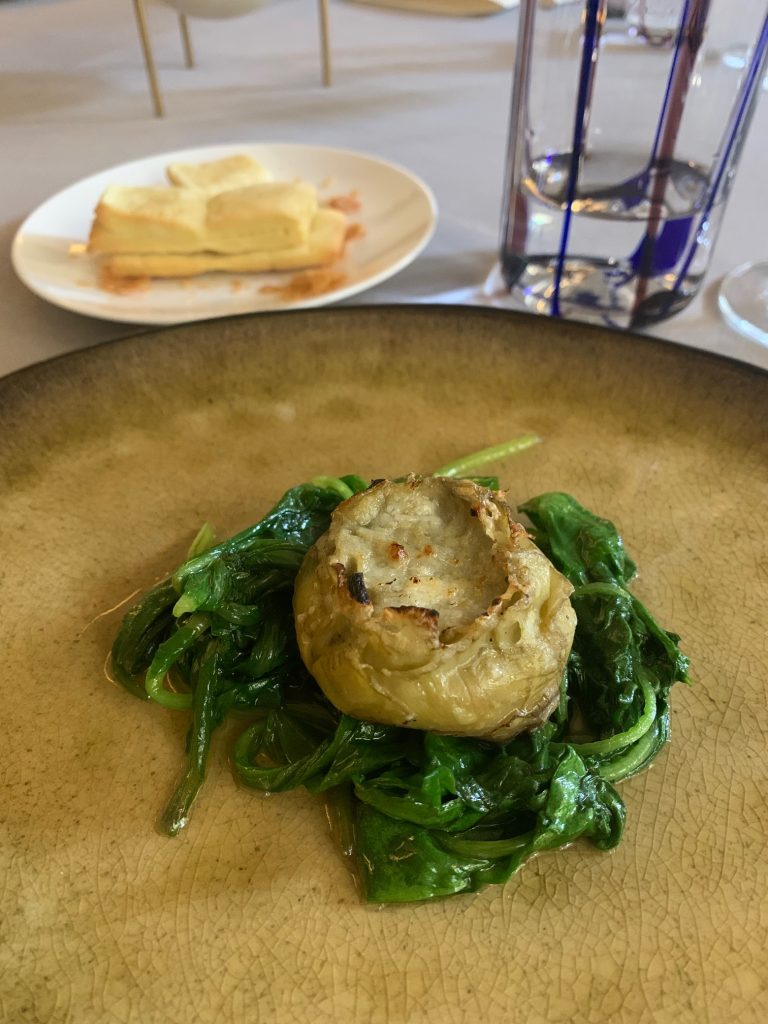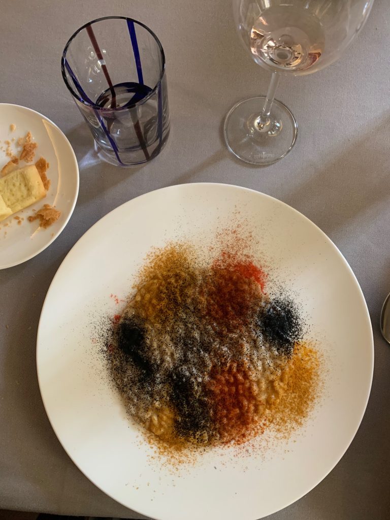 Il tiramisù fatto con olio d’oliva, pane croccante, tartufo ed erbe sinergiche, ci viene servito in una lattina di tonno; UNO è il carciofo sbollentato con ripieno di purea di gambi, senape fredda, salsa garum, ricoperto da un agrodolce di caramello, accompagnato da un’altra grande scoperta qui a Il Frantoio, un vino bianco le cui note richiamano i fiori di sambuco, la polpa bianca e matura della pesca e un sapore minerale, sapido, che si sposa perfettamente ai piatto; è Donna Elena, una delle tre interessantissime etichette prodotte dalla proprietà. Fatene scorpacciata, è un consiglio.