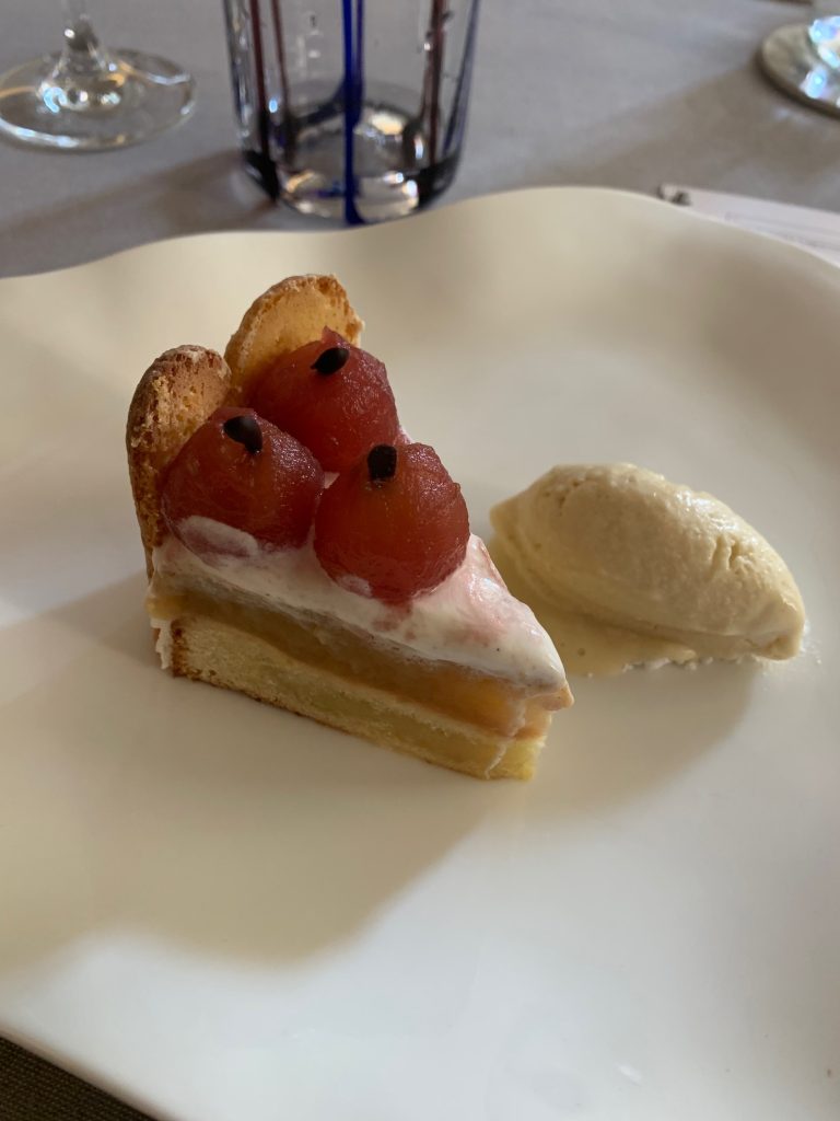 Non poteva mancare in menu il tanto chiacchierato foie gras etico, dove la parte dell’ingrassamento viene fatta da un’emulsione di olio evo, crema di mele, punta di nocciole, prugna e passito sagrantino.