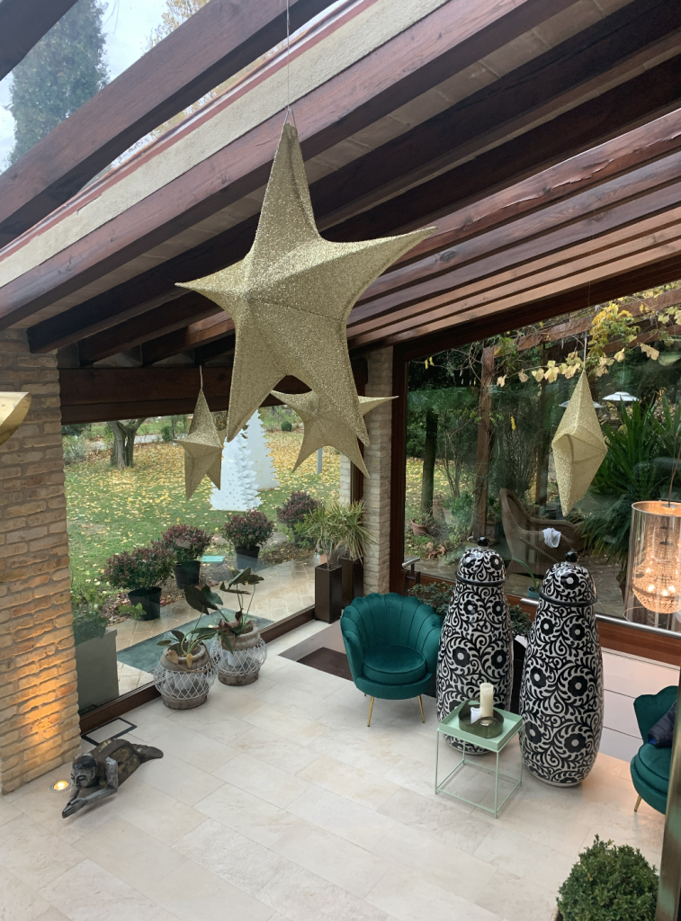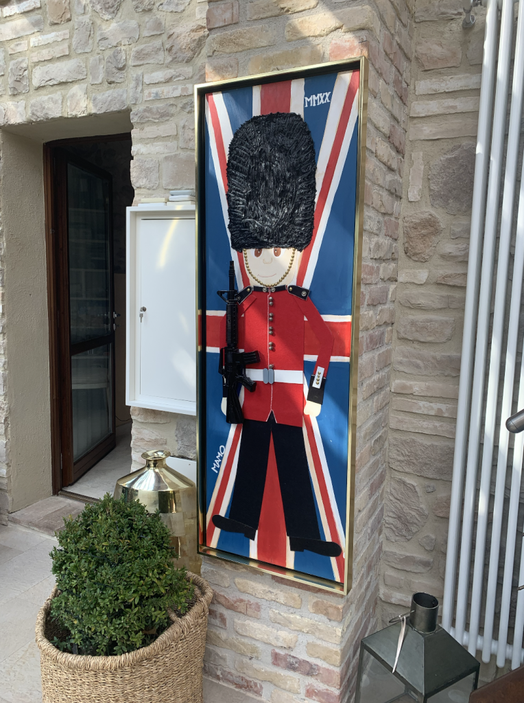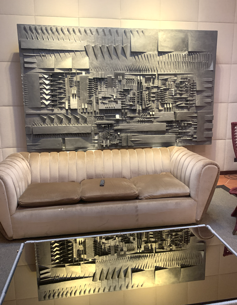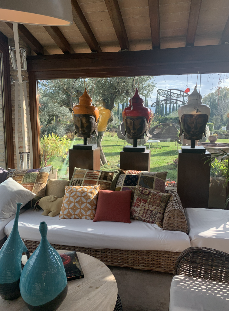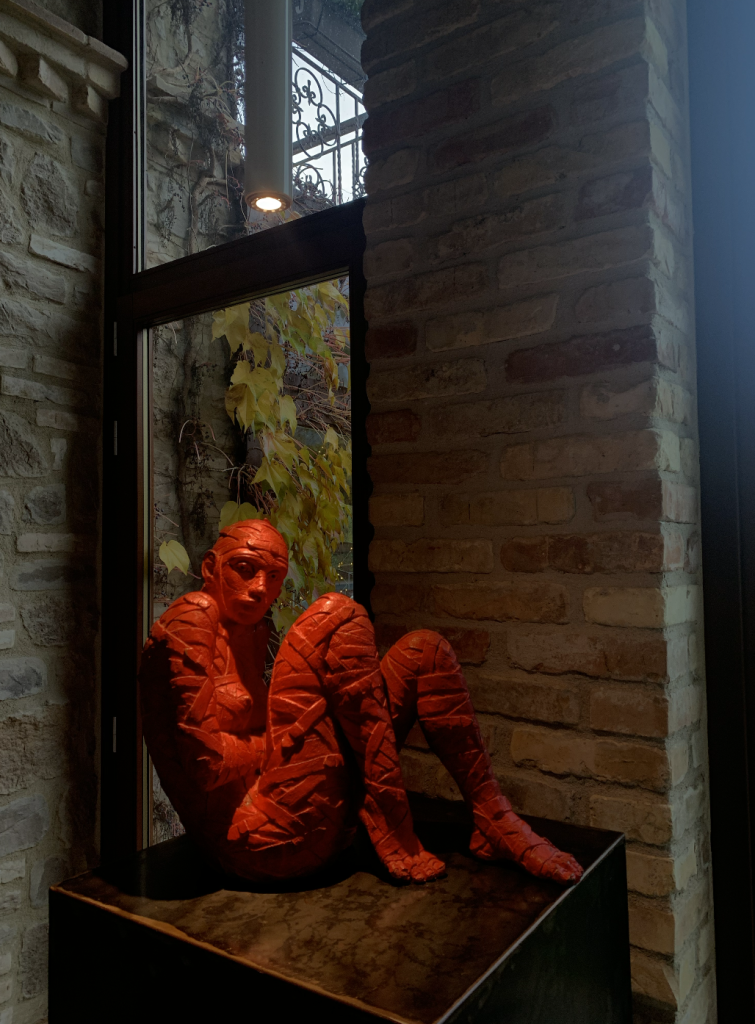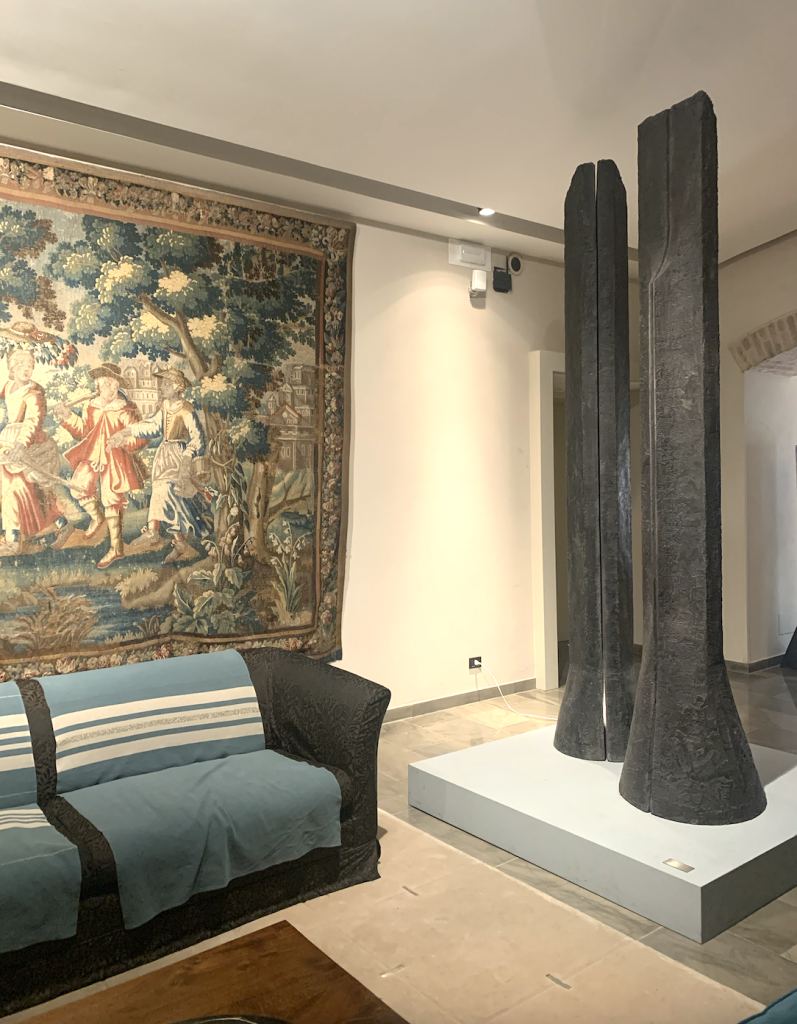 Le lampade chips in bronzo arrivano da un viaggio della famiglia a Marrakech; alcune sculture sono dell’artista romana Rabarama, come l’opera in bronzo intitolata “In cinta”, datata 2009 ed esaltata da un’illuminazione teatrale;