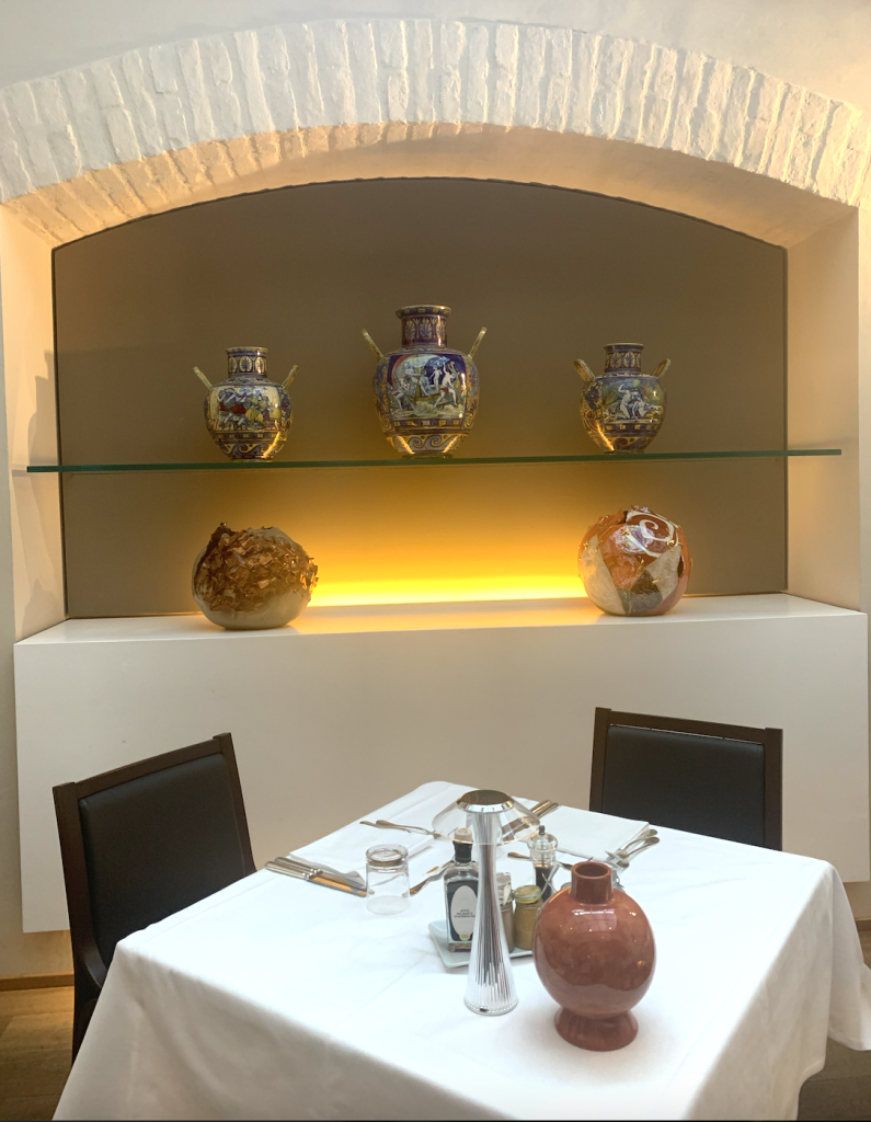 Travi a vista, ambiente elegante ed ottimo servizio al ristorante Nicolao del Park Hotel Ai Cappuccini dove ritorna, sui piatti, l’iconico simbolismo colorato di Capogrossi. Dal Menu che abbraccia la tradizione consigliamo il tagliere con selezione di salumi e formaggi umbri; la zuppetta di gamberi, ombrina, spigola e pescatrice in guazzetto di ceci; i ravioli di baccalà con salsa alla puttanesca; il tortino di ricotta con porcini e cialda al parmigiano e la crema al caramello con gelato allo zabajone abbinato ad un Pourriture noble (muffa nobile) Tenuta Decugnano dei Barbi, una tenuta di Orvieto che produce questo vino delizioso, da meditazione, proveniente dai vigneti Grechetto e Procanico 60%, Sauvignon Blanc 35%, Semillon 5%, frutto di una meticolosa vendemmia in più passaggi successivi, pressatura immediata e lunga fermentazione. Degno di nota anche il bianco Monteleto 2021, uno Chardonnay in purezza della Cantina Semente per accompagnare tutto il pranzo.