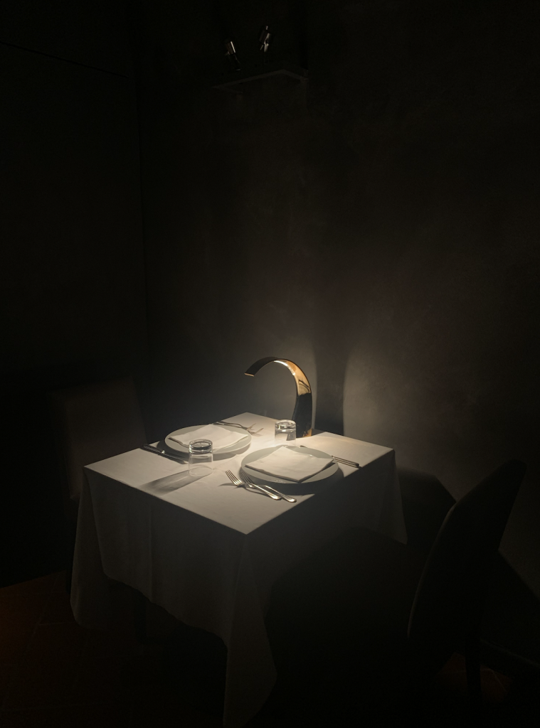 Tutto rimanda all’indiscusso protagonista, le foglie della pianta messe sotto resina sui tavoli, la piccola macina del frantoio che è un poggiaposate, le immagini fotografiche in bianco e nero sulle pareti, ma soprattutto l’olio quale assenza di grassi animali, burro, per una cucina sostenibile e godibile con costanza nel tempo. La cucina No Porn, ma New Born dello Chef Lorenzo Cantoni.