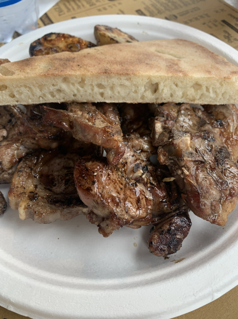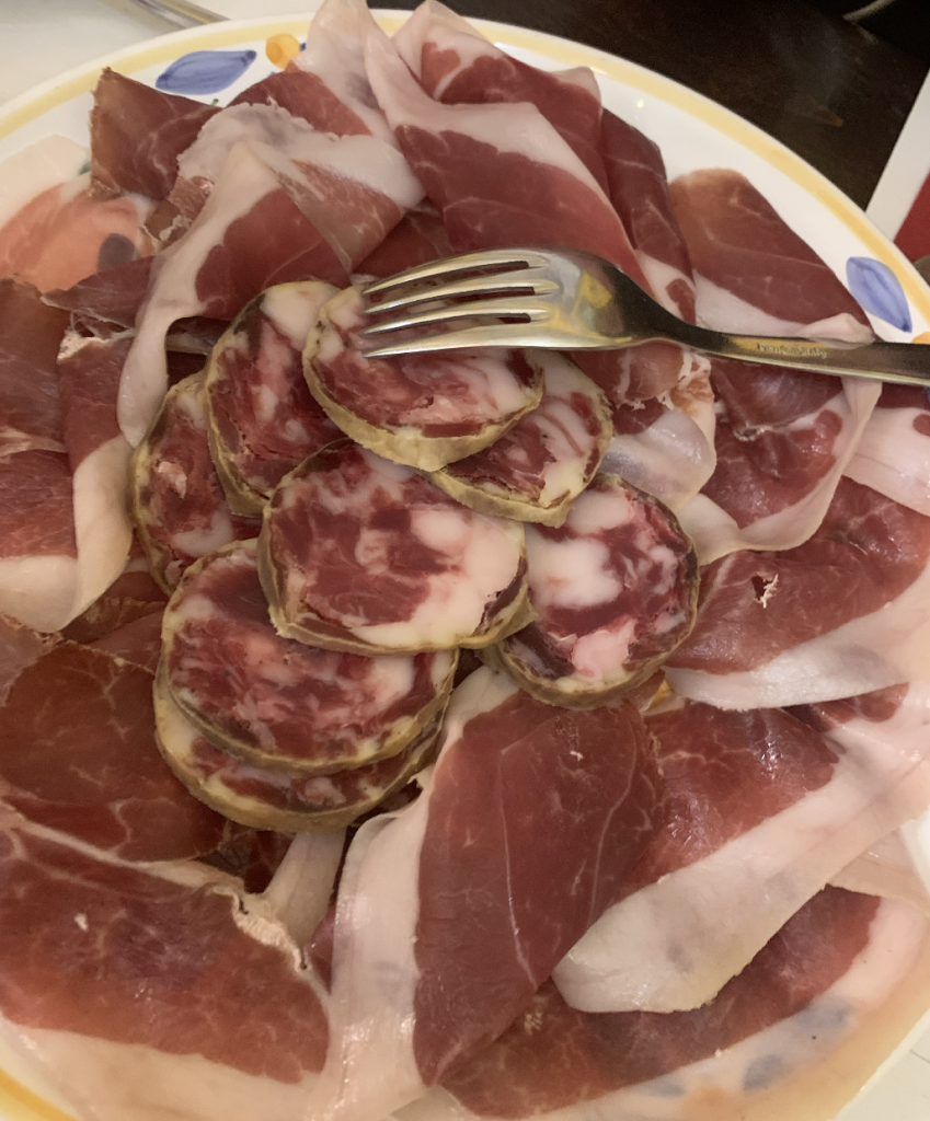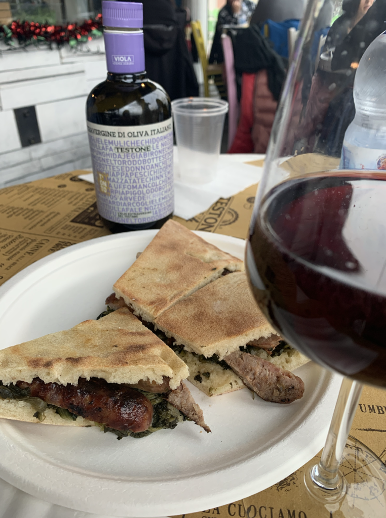 Qui potete assaggiare la vera torta al testo, la “focaccia” realizzata da un impasto di farina, acqua, bicarbonato e sale, cotta su di una pietra circolare detto testo, infuocato sotto le braci.