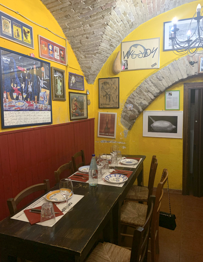 Qui non c’è una sola specialità, dovete abbandonarvi a tutto il menu consigliato dal proprietario, un barese in terra umbra: frittata con tartufo, salumi nostrani, coratella, stringozzi col tartufo, spezzatino di cinghiale, tozzetti con sagrantino, ricotta con le visciole, torta di noci e fichi e non vorrete più andarvene, salvo poi per finire col parlare di cruditè ‘nderr a la lanz con Luciano Sabbatini, luogo del cuore di tutti i baresi, patria del pesce crudo, che va benissimo il tartufo di terra, ma anche quello di mare che bontà!