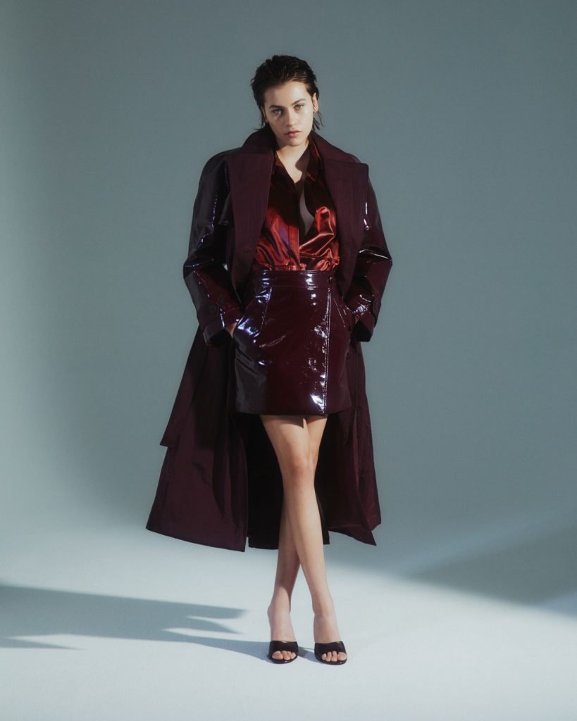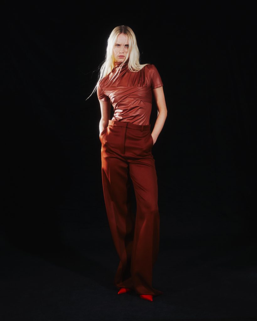 Ai trench tecnici sono collegate delle mantelline, il velluto cattura luce e calore, e l’effetto rettile dato dalle paillettes ci riporta nelle terre selvagge dentro cui sono stati inseriti i disegni delle ginestre, l’unico fiore che cresce in territori ostili come quelli vulcanici. E’ il fuoco il filo conduttore della collezione Autunno Inverno ’23/’24, che scioglie metalli argentati come il jersey effetto pelle e che prende vita nei long dress di raso cinzato.
