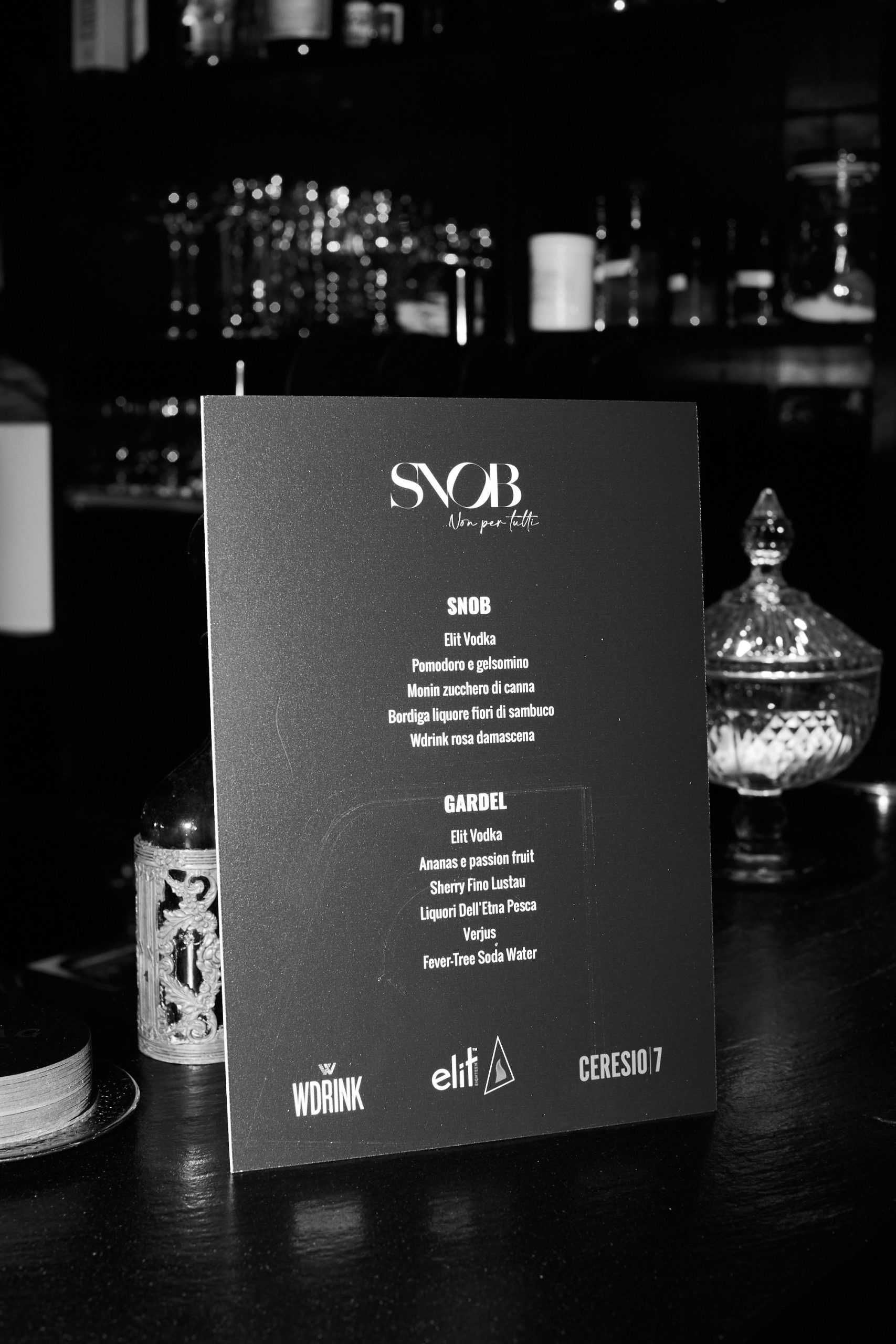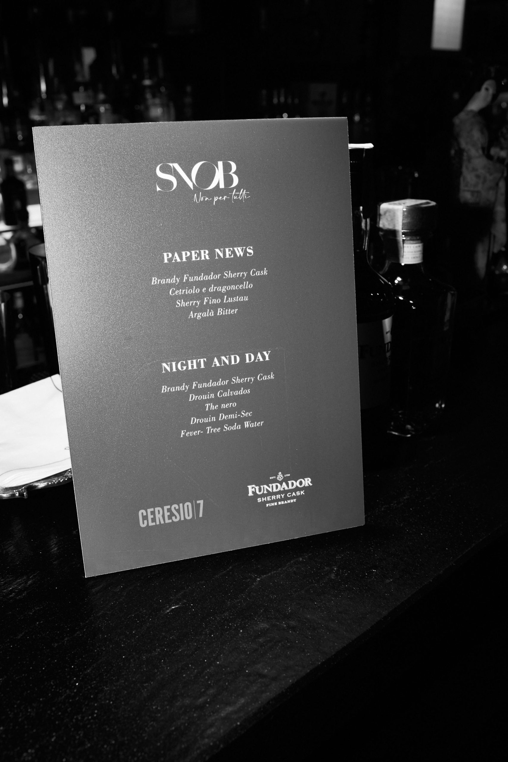 La Drink List dell’evento è stata creata in collaborazione con gli esperti mixologist del Ceresio7, Mattia Trezza e Ludovico Chiumello, utilizzando 2 brand d’eccezione del pacchetto Velier, azienda storica di distribuzione distillati luxury, Elit Vodka, la vodka più premiata al mondo e Brandy Fundador,  il primo brandy spagnolo in assoluto ad essere etichettato con la dicitura “Brandy de Jerez” (prodotti provenienti dalla storica regione vinicola).