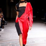 L’asimmetria degli abiti viene scandita, in alcuni casi, da un rosso acceso accattivante che alleggerisce, per quanto possibile, l’intero progetto creativo.