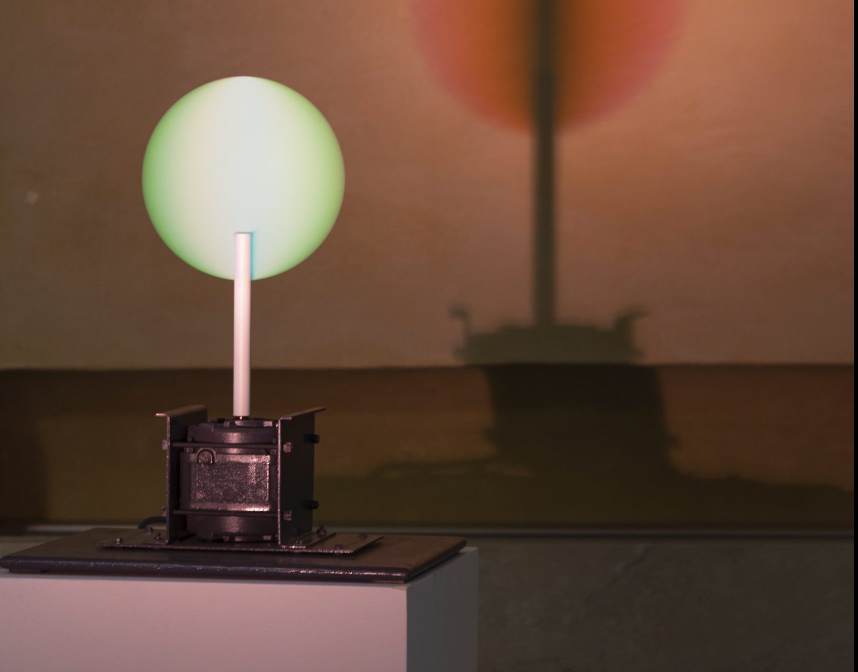 Prisma Meccanico composto da un proiettore di luce sintetica e da un supporto di alluminio a forma di disco dipinto di bianco, verticale, rotante su se stesso ad elevata velocità che raccoglie la luce e la riflette scomponendola in una suggestiva gamma cromatica.
