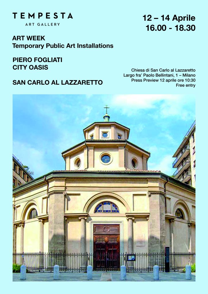 In occasione dell’Art Week dal 12 al 14 aprile 2023 Tempesta Gallery esce dai confini del suo spazio di Foro Bonaparte per installare parte del corpus di opere del visionario artista Piero Fogliati nella chiesa seicentesca di San Carlo al Lazzaretto in Porta Venezia.