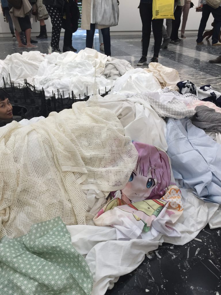 Padiglione Giappone. Takahiro Iwasaki porta con sé un po’ di cianfrusaglie, roba che regaleresti al rigattiere, panni da cucina, vecchie t-shirt logore, le mini sorprese che trovi nell’ovetto Kinder, quelle che puntualmente il cane si infila in bocca per poi passare, ben sbavate, tra le mani del tuo bimbo. Iwasaki ci gioca un po’, crea delle montagne giapponese, quelle che tanto gli mancano, la silhouette delle città con torri e grattacieli. Ma poverino, diamoglieli questi Lego, che almeno sono colorati e si diverte di più!