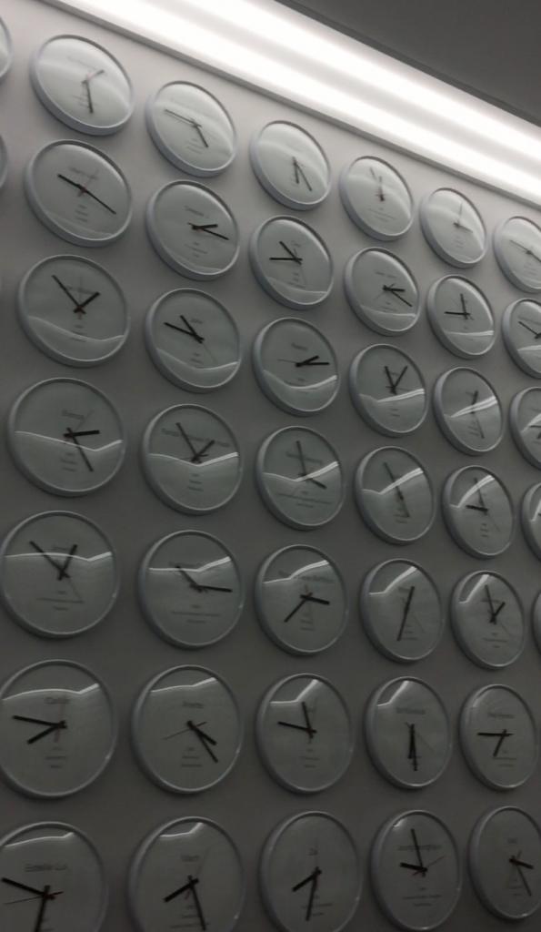 Padiglione Corea – Lee Wan, da una porticina che ricorda quella dello studio di D’Annunzio, ci introduce in una stanza asettica, bianca, un quadrato con appesi 600 orologi che segnano le differenti ore dei paesi del mondo; nomi, nazionalità, occupazioni di persone da lui intervistate che attendono l’ora del pasto, dopo quella del lavoro. Già vistoooooo!