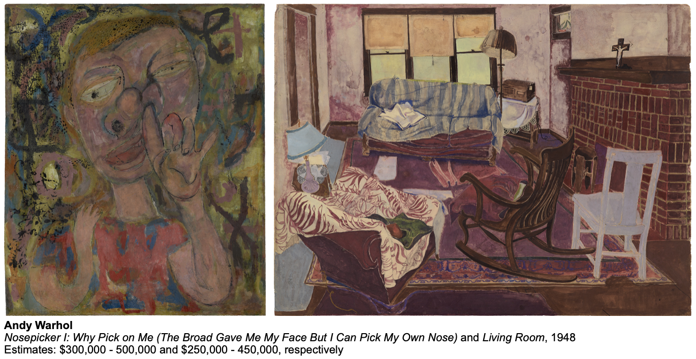 In occasione del vendita serale 20th Century & Contemporary Art di novembre a New York, Phillips batterà all’asta i primi due dipinti di Andy Warhol: Nosepicker I: Why Pick on Me (The Broad Gave Me My Face But I Can Pick My Own Nose) e Living Room, entrambi realizzati durante gli ultimi anni dell’artista al Carnegie Institute of Technology (ora Carnegie Mellon University). Eseguite nel 1948 e indicative del genio che sarebbe diventato, queste incredibili reliquie di uno dei più grandi visionari del XX° secolo sono rimaste presso famiglia dell’artista per oltre settant’anni, fino ad ora. Prima della vendita di New York del 15 novembre, i due dipinti saranno presentati a Southampton, Los Angeles, Londra e Parigi.