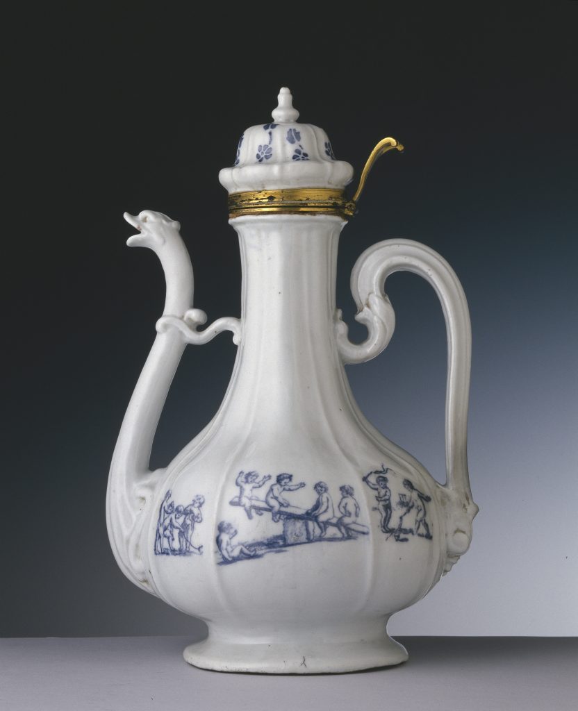 Tra i decori settecenteschi della Manifattura Ginori il ‘bassorilievo istoriato’ è il più prezioso e caratteristico. Composizioni a soggetto mitologico, tratte da incisioni o da placchette metalliche, venivano riprodotte a bassorilievo in porcellana con appositi stampi e poi applicate a crudo alle pareti di tazze, caffettiere o altro vasellame. Erano vendute in bianco oppure finemente dipinte a mano in policromia e oro, come l’esemplare esposto in mostra.