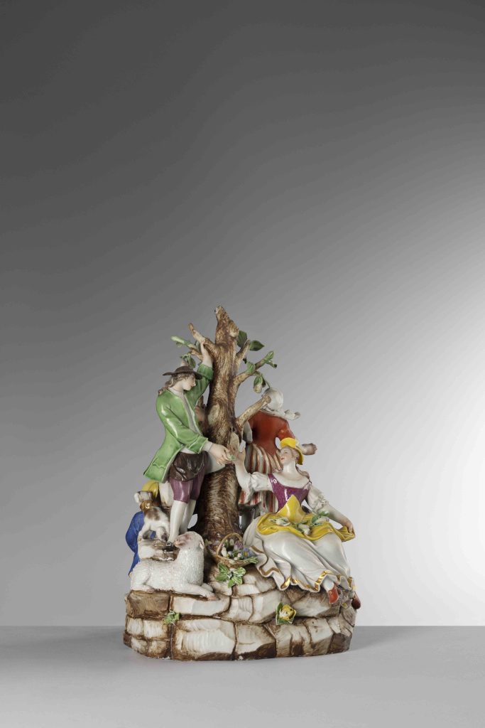 In mostra sono esposte anche graziose e variegate composizioni, databili intorno alla metà del Settecento, che avevano la funzione di apparecchiatura per tavole da dessert. Tra queste, i gruppetti in policromia d’ispirazione arcadico-pastorale raffiguranti scene campestri, maschere di Arlecchino e Arlecchina tratte dalla Commedia dell’Arte con la funzione di rinfrescatoi per bottiglie e un’alzata con il tritone che sorregge sulla testa una conchiglia, evidente allusione alle fontane fiorentine commissionate dai Medici, a cui il marchese Ginori rende omaggio.