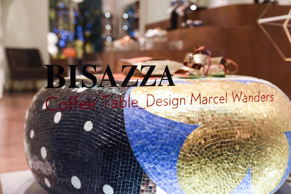 Gli iconici coffee tables Alice e Cecilia, firmati dal designer olandese e realizzati con tessere in mosaico di vetro e oro tagliate a mano, saranno esposti nelle vetrine della boutique di Via della Spiga per tutta la durata del Salone del Mobile, che si terrà dal 12 al 17 aprile a Milano.