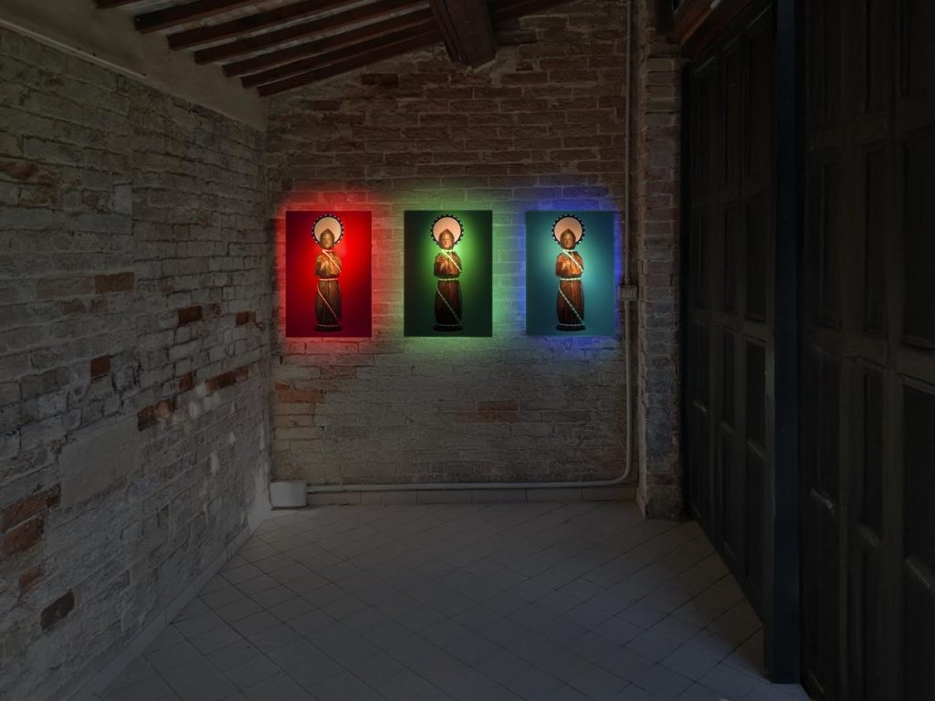 Il fulcro della mostra veneziana è “Gabriel Angel’s White Light“, evoluzione di un progetto nato nel 2022 con l’artista Valerio Fausti. Un angelo ligneo trecentesco viene trasformato in un trittico pop con i colori RGB, avvolto in luci led e retroilluminato: nello spettro luminoso, accompagnato da installazioni sonore, diventa luce bianca pura. «Come una farfalla che rompe il bozzolo», l’angelo abbandona la sua sacralità per abbracciare una nuova identità libera.
