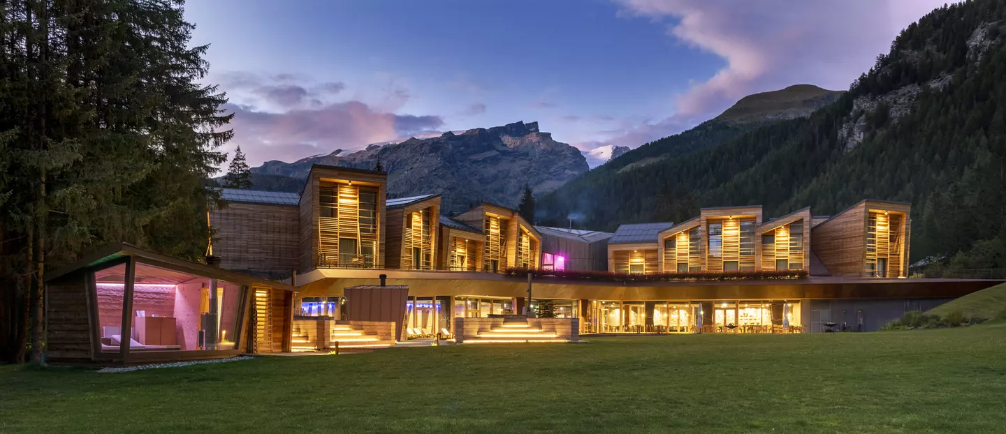 L’hotel risponde perfettamente ai canoni di accoglienza, che sono il vero spirito del gruppo Aethos; l’arredo è elegante e minimale, con maxi camini centrali di design, pareti in legno come i coffee table, e poltrone in tricot. Molti gli accessori che omaggiano la montagna, come le lampade cervo e le pareti con i moschettoni.