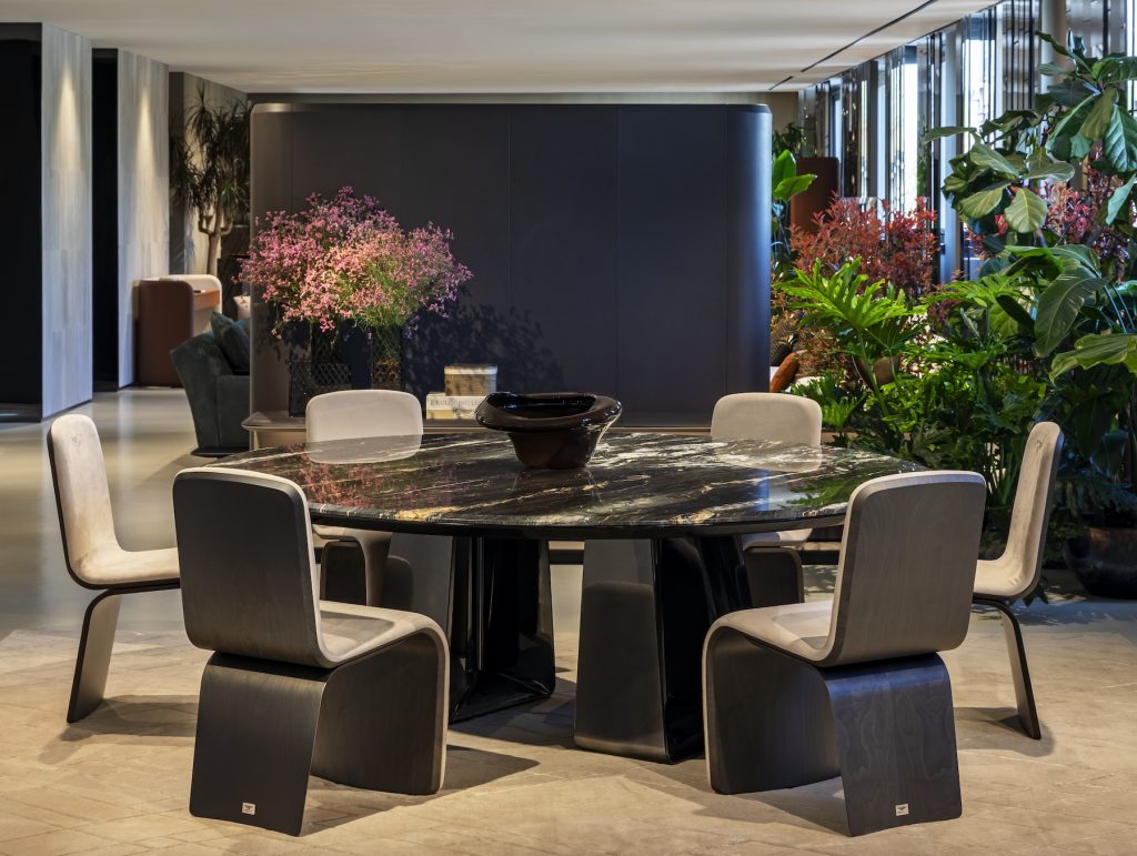 La doppia base si sviluppa in un sofisticato gioco di sottrazioni e smussature, che ne enfatizza l’effetto aerodinamico. Il piano a doppio spessore crea un equilibrio armonioso di volumi e proporzioni, grazie a eleganti cambi di sezione. Il tavolo Fenton è disponibile nelle versioni rettangolare e rotonda, con un’ampia gamma di dimensioni. La versione rettangolare raggiunge una lunghezza massima di 3,60 metri, mentre la rotonda arriva a un diametro di 2,20 metri, la misura più ampia mai proposta da Bentley Home. Un’evoluzione che risponde alle esigenze di clienti con ampie zone living o ambienti corporate, affiancando configurazioni compatte pensate per garantire versatilità in diversi contesti abitativi.