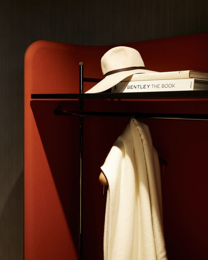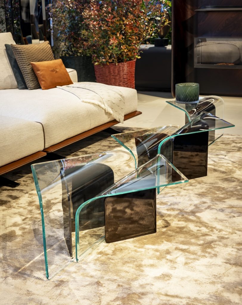 La zona living accoglie anche i nuovi coffee table Verve, espressione di innovazione progettuale. Un elemento in vetro curvato, ispirato al motivo iconico Bentley, si poggia su una base in metallo, creando un deciso contrasto materico. La base è arricchita da una raffinata incisione laser con il motivo Bentley diamond, dettaglio testurizzato che amplifica la presenza scultorea dell’oggetto. Proposti in diverse altezze, i tavolini possono essere combinati per generare un dinamico gioco di volumi.