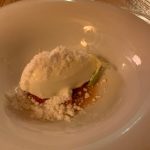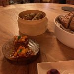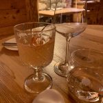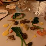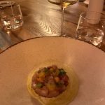 Iniziando con un aperitivo Belle Epoque, Vermouth di Torino, si passa ai loro cracker al burro, polpettine di salsiccia di Bra cruda, bignè al parmigiano, sardine in saor, il pane fatto in casa su cui spalmare uno spumoso burro montato leggermente salato. In accostamento alla battuta di salmerino con le sue uova, tipico pesce delle Alpi, salsa allo yogurt e prezzemolo, un bianco delle Langhe – Le Coccinelle -. Con il risotto mantecato con Parmiggiano Reggiano 48 mesi da vacche rosse e fondo bruno di verdure, un Dominio de Anza, un rosso equilibrato, espressivo e dai sapori fruttati; nel terzo piatto, un quadro astratto con punte di colore rosso dato dai gamberi, una scelta delle “nate povere per diventare ricche”: le interiora.