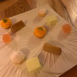 Vasta la scelta di formaggi: due carrelli di prodotti tra cui compaiono i ricchi formaggi fienati delle Langhe, un Castelmagno di montagna e dei formaggi al peperoncino, da abbinare al miele o al mosto. Per rinfrescare la bocca, una gelatina di pompelmo rosso, olio al mandarino e oliva secca; come dessert un gelato allo yogurt di latte di capra con fragole fresche e polvere di cioccolato, abbinato ad una Geisha, birra del territorio, interessante scoperta che sta tra due monti, da una parte l’autentico amaro di una birra scura, e dall’altra il dolce retrogusto di un passito. Assolutamente da riprovare. Eccellente la pâtisserie, con tenere gelatine al mandarino, gianduiotti e gelèe di albicocca.
