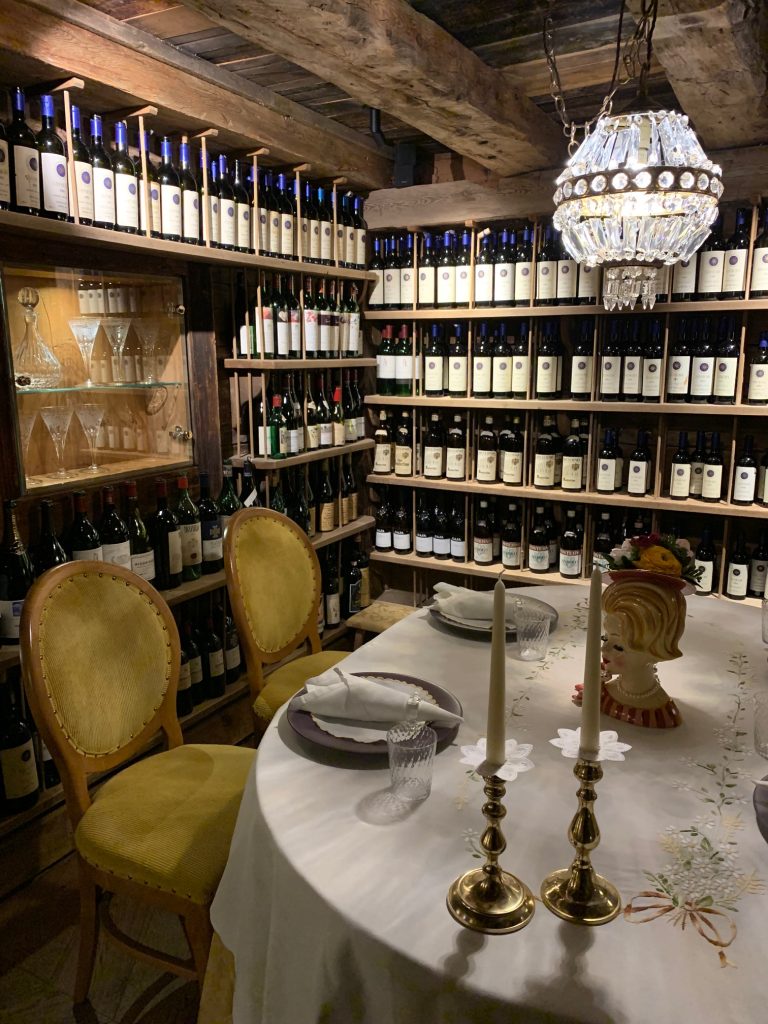 Dalla cantina si contano 3000 etichette e 30000 bottiglie, alcune aperte nella zona che un tempo era dedicata agli amici di Ernesto, il proprietario, poi passata ad angolo degustazione e circondata da bottiglie, vuote ça va sans dire, con tanto di dedica sull’etichetta, simbolo di momenti goliardici.