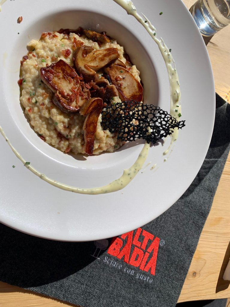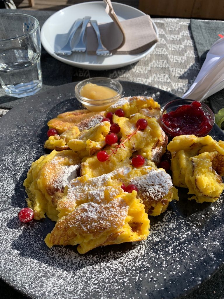 Piatto stellato dell’evento “Sciare con gusto”, il filetto di cervo marinato nel whisky, topinambur e salsa ai mirtilli rossi e cioccolato fondente dello chef Davide Caranchini del ristorante Materia (1 stella Michelin). Ma la coccola del Pralongià arriva con il dolce tipico ladino, la Kaiserschmarrn, una frittata a base di uova e latte, nata in antichità da un errore dello chef dell’imperatore Francesco Giuseppe d’Austria che aveva dimenticato sul fuoco una crêpe e che per coprire la bruciatura la spolverò con zucchero a velo servendola scomposta accanto a della marmellata. All’imperatore piacque così tanto, che da allora diventò il suo piatto preferito; la ricetta cambia di casa in casa, qui al Rifugio è certamente la migliore assaggiata fino ad ora, ricca di uova, saporita e morbida, ottimo carburante per ritornare a valle e salutare con un “Arrivederci” il rifugio dove un gruppo musicale canta i successi italiani anni ’80 facendo ballare tutte le generazioni.