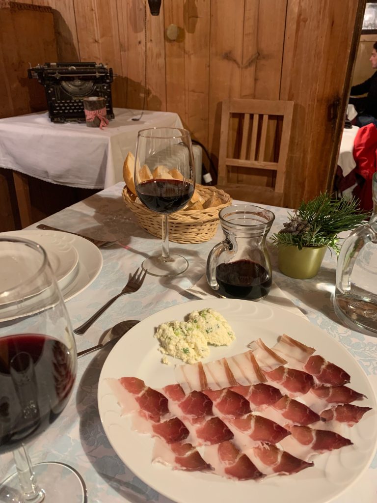 Per iniziare una zuppa d’orzo accompagnata da un piatto di Tutres, frittelle ripiene di spinaci e ricotta o crauti, che da tradizione si mangiano con le mani; mezza luna con patate e formaggio, canederli con polenta e gulash, crapfen con marmellata di mirtilli rossi e per concludere una grappa al pino mugo molto amara.