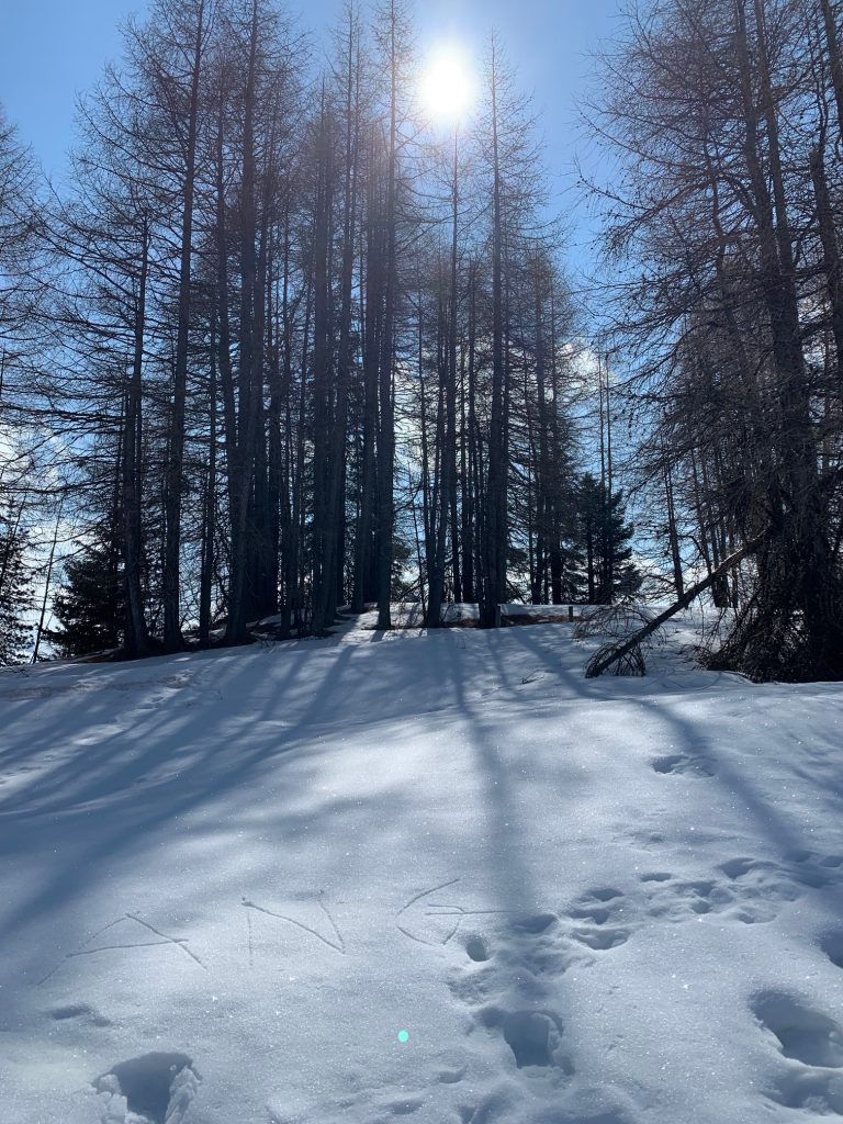 E’ un deserto bianco la strada battuta da poche impronte, il resto degli sciatori lo raggiunge lungo le piste, tutt’intorno le cime innevate che ti guardano e ti fanno sentire piccolo eppure grande, parte di questo incredibile progetto chiamato Terra. Qui arriva quasi la voglia di perdersi, di lasciare l’inutilità delle cose materiali e di riscoprire quella vita umile e onesta che descrive con profondità Tolstoj.