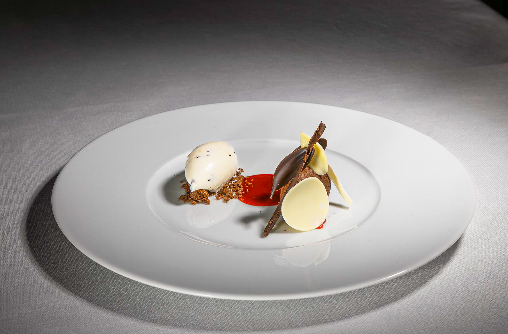 A seguire il filetto di capriolo con cappuccio fondente, mostarda di pere e frutti rossi con una glassa lucida da specchiarsi, e a chiusura il pre-dessert con kiwi, cocco, gel di limone e pepe lungo che prepara il palato alla dolcezza finale con freschezza tropicale e un tocco speziato inaspettato. Il fondente al cioccolato con gelato stracciatella e coulisse al melograno chiude il percorso con intensità, freschezza lattica della stracciatella e l’acidità fruttata del melograno.