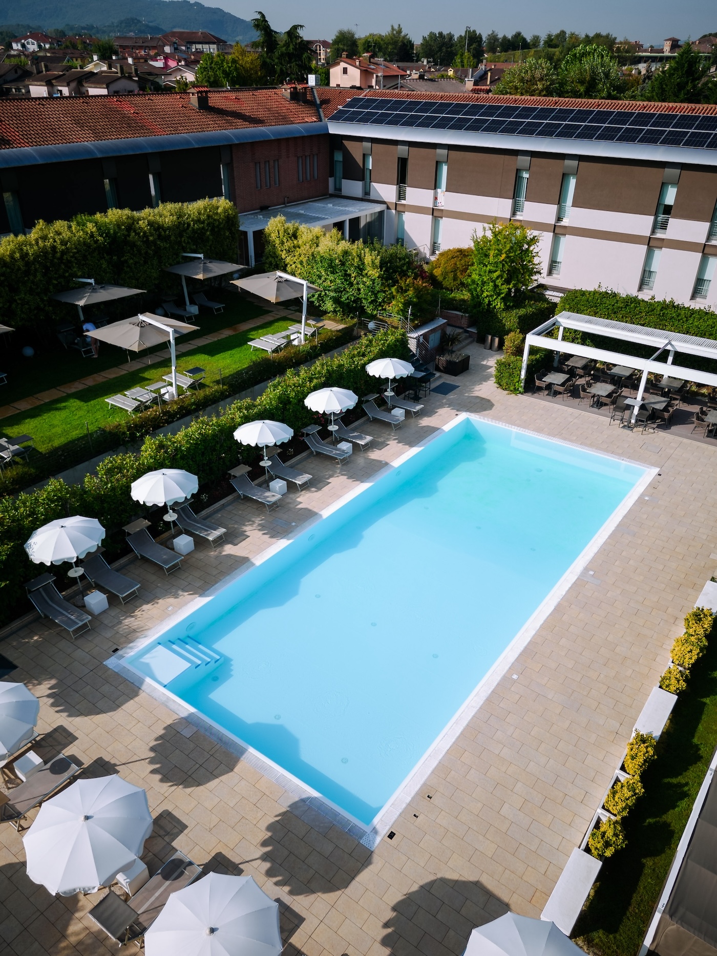 Nel periodo estivo, la piscina esterna circondata dal verde del giardino diventa il fulcro dell’esperienza wellness, offrendo un’oasi di pace immersa nella quiete dei colli vicentini.