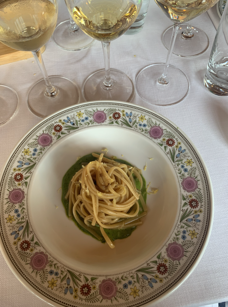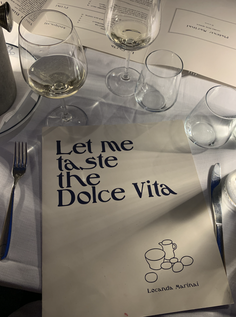 “Let me taste the Dolce Vita” è il motto della carta, piatti semplici e gustosi, piatti della tradizione italiana, come le linguine alla burrata, alici e pangrattato alle renette; frittelle di baccalà e salsa tartara; spaghetti fatti in casa alla polpa di granchio; un grande e intramontabile classico, il crudo di gamberetti in salsa rosa con pisellini verdi; rombo in panatura e salsa al caramello; alici bergounioux impanate alle nocciole; tarteletta al limone e meringa italiana, e una deliziosissima insalata di foie gras affumicato, ricetta che torna dal menu del padre, Marco Pani.