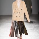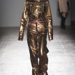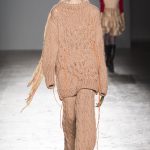 Effetto tridimensionale per la maglieria che diventa protagonista, declinata in total look di alpaca, dal dolcevita al pantalone a zampa; il gessato maschile viene abbinato al pizzo valencienne, il velluto a macro coste nei toni della terra, del cammello, e i plissé bronzati, silver e laminati.