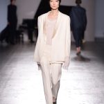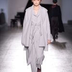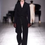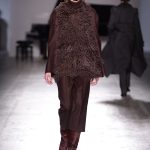Daniele Calcaterra, designer della maison, firma una collezione geometrica, dove i crêpe si fanno pesanti e fluidi, gli accoppiati giapponesi rivisitano il fresco di lana creando nuove sonorità materiche e voluttuose. I mikado, in seta pesante e cruda, si dettagliano di nuovi ricami in angora e mohair tracciando proporzioni nuove tra forma e ricerca materica, che da sempre caratterizza il personale codice interpretativo CALCATERRA.