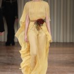Sono rose, ninfee, gigli, sono giardini colorati dell’epoca preraffaelita, la donna Alberta Ferretti indossa i rossi sgargianti di Ford Madox Brown, rappresentati al meglio nella veste di Romeo in “Romeo e Giulietta” del 1870; i gialli intensi in total look o contrastati dal nero; si ammanta di mistero quando arriva la notte e si copre con grossi mantelli regali e maschere.