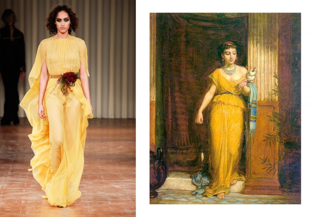 sx Alberta Ferretti – dx “La filatrice” di John William Waterhouse 1874