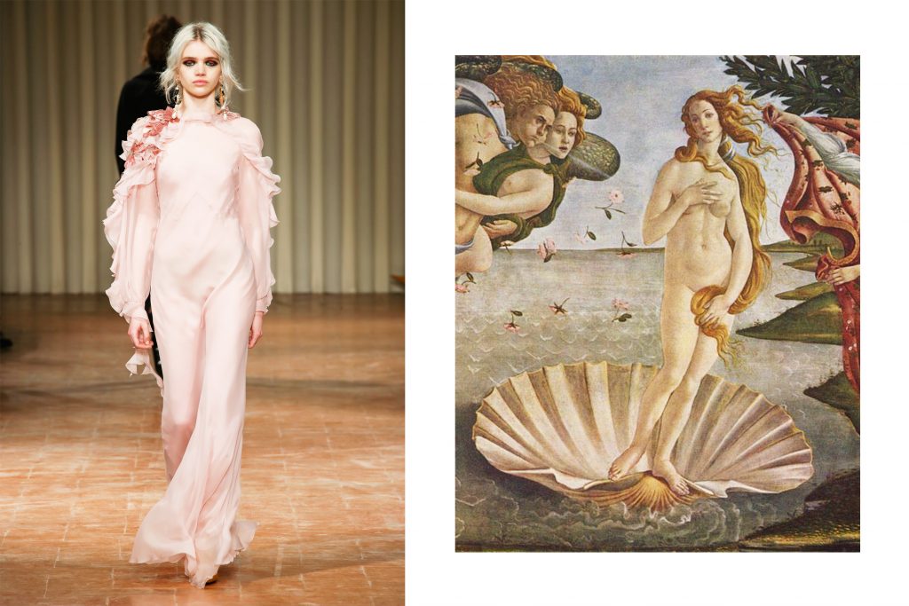 sx Alberta Ferretti – dx La Nascita di Venere di Sandro Botticelli 1482-1485 cca