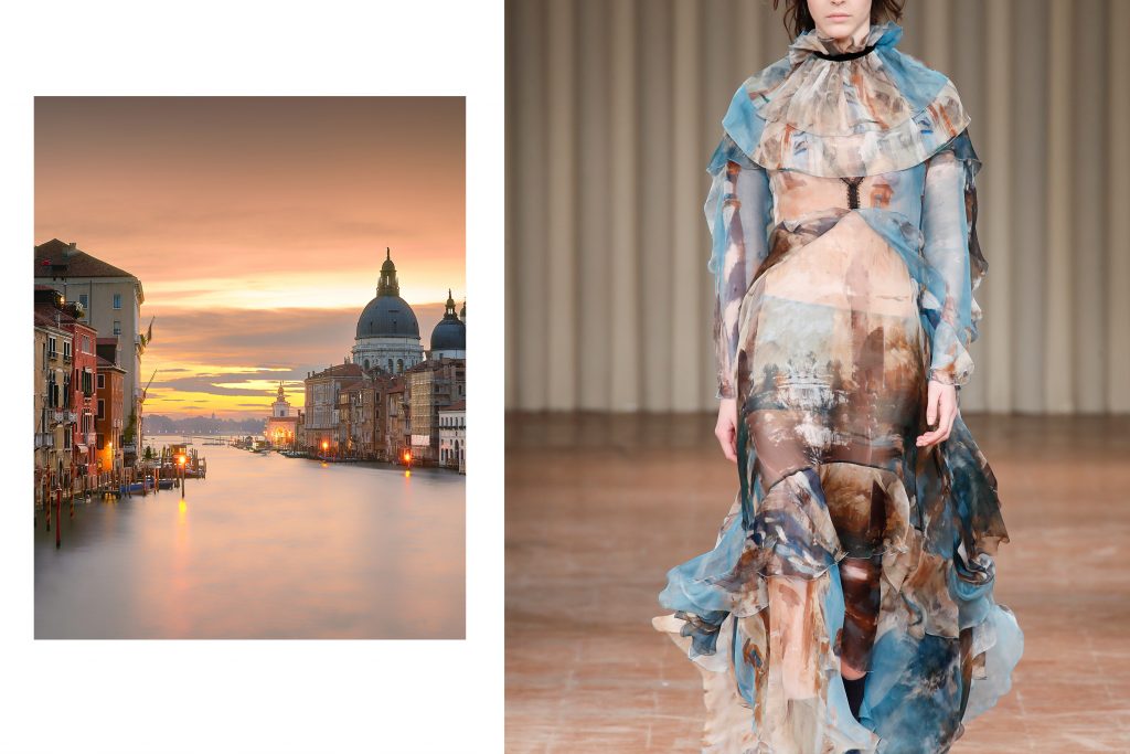 sx un’immagine di Venezia – dx un abito Alberta Ferretti