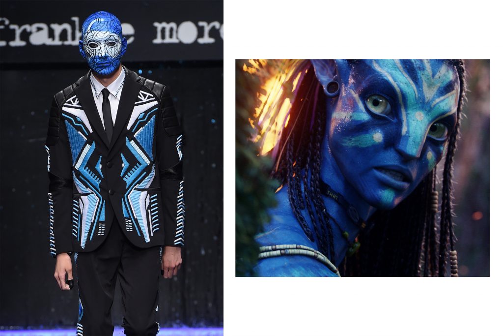 La collezione Primavera Estate 2018 di Frankie Morello disegna uno spazio dove umanoidi Avatar si mescolano con soggetti che sembrano arrivare da una realtà tribale, indossano grosse collane di legno, pietra, ossi e sugheri. E’ un uomo che si sposta dai fondali marini, camminandoci sopra come un Cristo e come Christo ha permesso recentemente con la sua opera “The Floating Piers“, la passerella gialla galleggiante sul Lago d’Iseo.