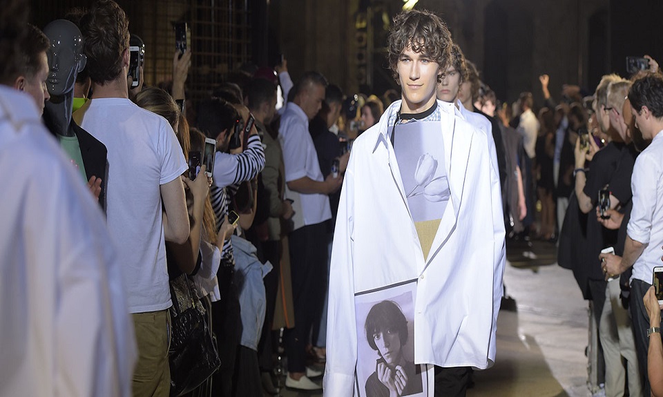 Il designer, presenta un defilé paradigmatico del suo estro. La passerella è libera da sedie: il front row è una mischia di un pubblico pronto ad applaudire il lavoro dello stilista.