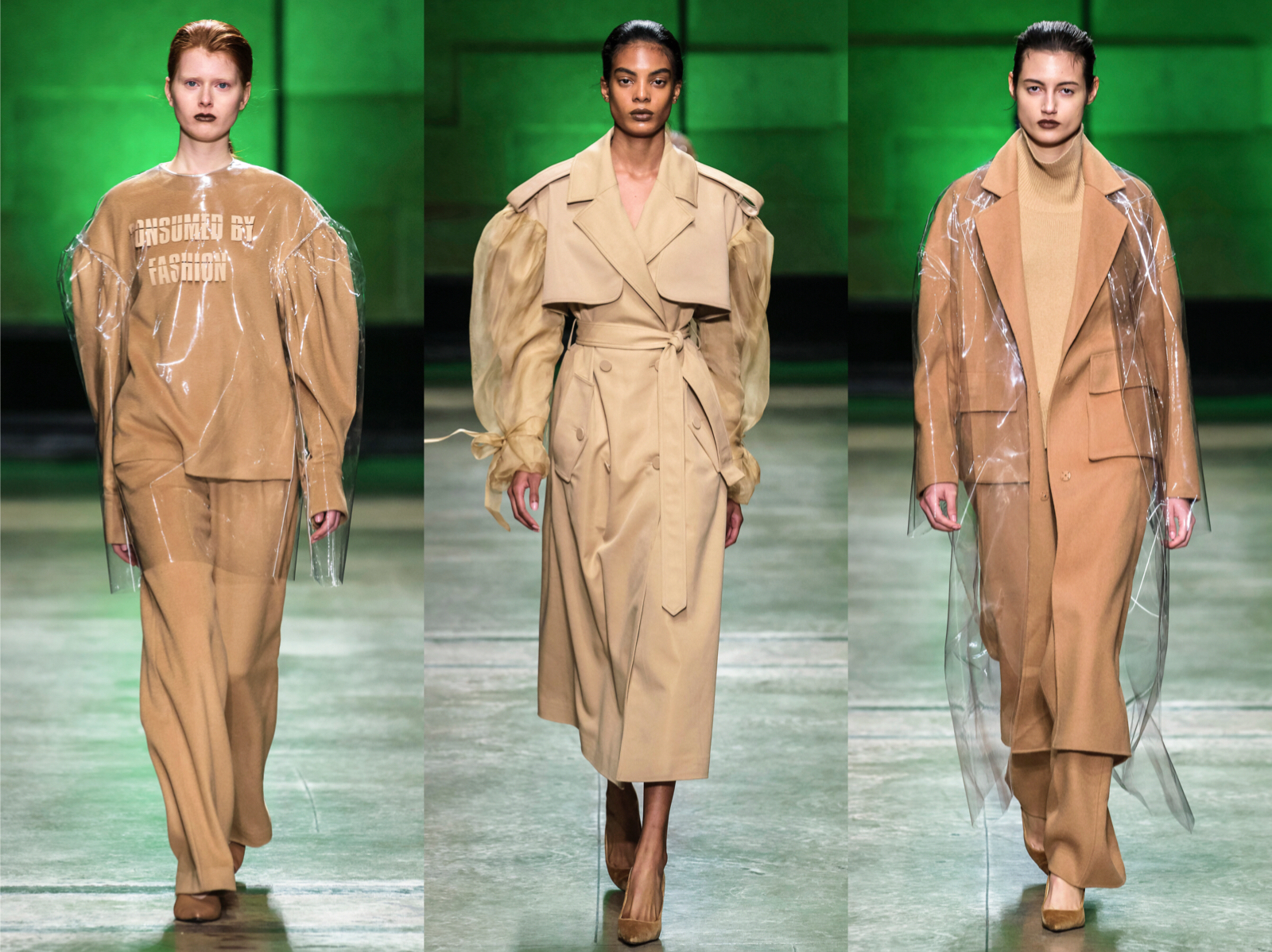 E ce n’è per tutti i gusti, per le romantiche i long dress in velluto, per le busy women trench old style ma con le maniche in voile, che regalano un tocco femminile e trendy, così come di tendenza l’impermeabile in pvc che copre il cappotto cammello in lana, tutto tono su tono.
