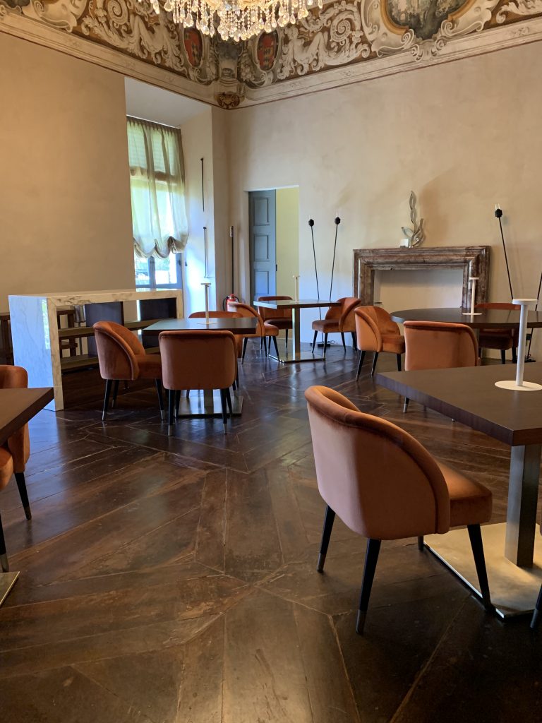 Omaggio al grande imprenditore italiano Adriano Olivetti, fondatore della prima fabbrica italiana di macchine per scrivere, il “Caffè Alla lettera“, lo spazio moderno dove tornano parole e lettere, come quelle scritte sui tavoli/tasto neri, adornati dalle sedie in velluto blu, il luogo dedicato all’aperitivo con un Vermouth Carlo Alberto Riserva Rosso, o ad una cucina sana e veloce creata dallo stesso chef del ristorante “Alessio I”, Massimo Mascia, un ambiente raffinato nelle sale affrescate dagli stemmi delle famiglie nobili che lo hanno vissuto in passato, dotato di cucina a vista per uno showcooking ad alte temperature.