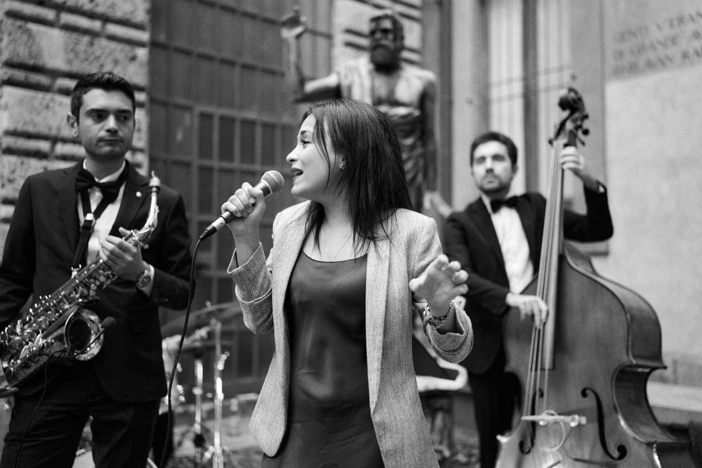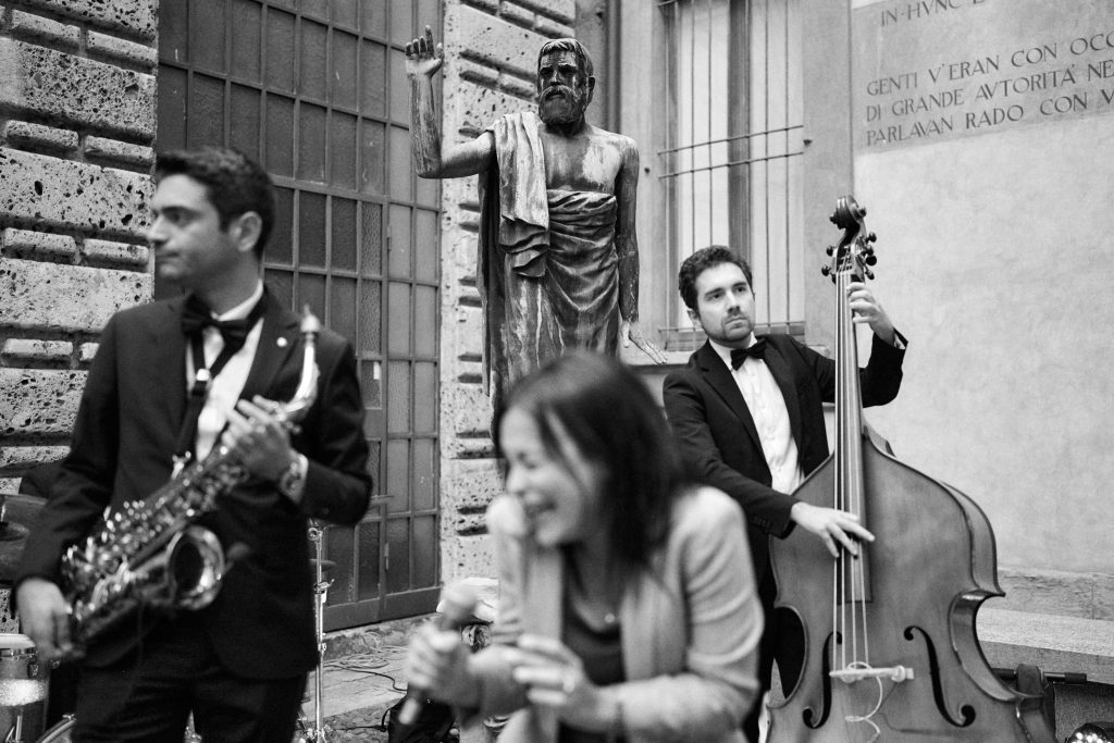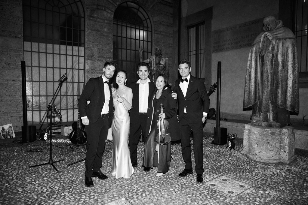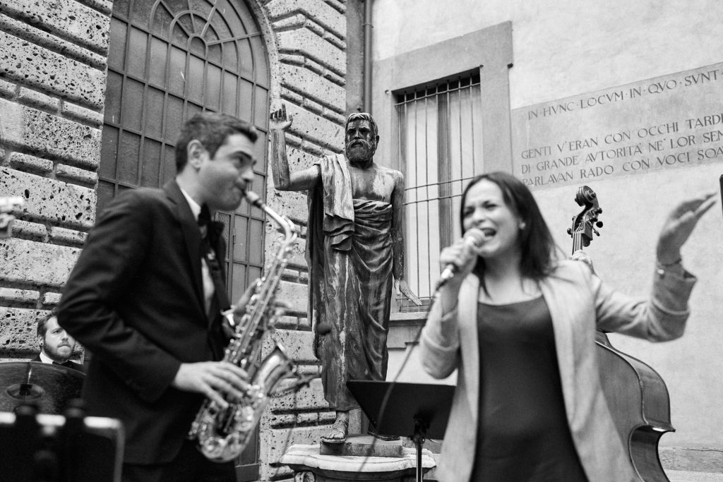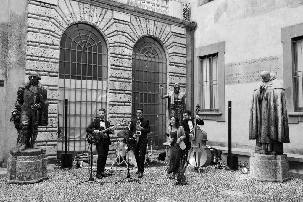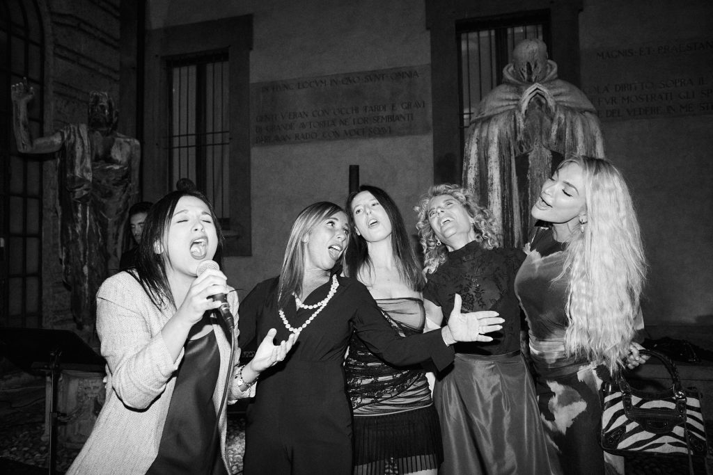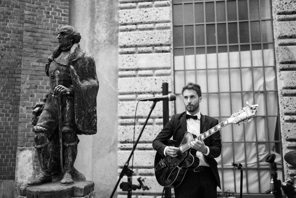 Un’atmosfera magica accompagnata da musica jazz e swing con voce femminile di Ambra Lo Faro e la prestigiosa location circondata dalle imponenti statue degli Spiriti Magni, i nomi d’intelletto, spirito e dignità di cui parla Dante, da Chateaubriand a Goethe, da Shakespeare a Platone.
