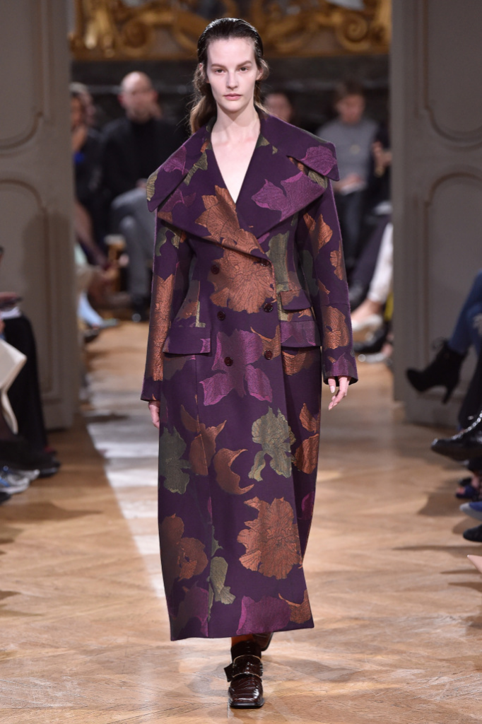 Tanti i riferimenti storici che costituiscono ispirazione predominante di una prova magistrale per Galliano: il designer sceglie stavolta di lasciarsi ammaliare dallo charme di una delle donne più affascinanti della storia, protagonista di alchimie misteriose e leggendaria icona di stile, la marchesa Luisa Casati Stampa di Soncino (qui un pezzo su di lei). La blasonata musa nonché amante di Gabriele D’Annunzio, sublime incarnazione della dark lady per antonomasia, tra fascino sulfureo e suggestioni oniriche, diviene protagonista assoluta del défilé di Galliano. Largo ad un tripudio di suggestioni tailoring per capi ad alto tasso scenografico, che si alternano a note rétro, a partire dagli istrionici copricapi, che ricordano da vicino lo stile iconico della marchesa, figura di spicco del jet-set internazionale. Non era raro, secondo le cronache mondane dell’epoca, incontrarla per le calli veneziane vestita solo di una pelliccia, mentre portava a spasso le sue pantere. Emblema dello stile degli anni Venti, la marchesa incarnava certo dandismo in gonnella che all’epoca appariva quantomai rivoluzionario rispetto ai diktat imperanti sulla figura femminile: potenti gli echi del passato tornano in auge in una collezione che unisce mirabilmente note mannish alla femminilità Art Déco di capi impreziositi da balze, per silhouette svolazzanti e contrasti iconici. Potenti i capispalla in jacquard di seta, che raffigurano pattern floreali con crisantemi e tapestry che profuma di antico, tra pigiama palazzo e velluti dévoré impreziositi da motivi iconici. Non mancano maglie in mohair, bluse a collo alto e capi dalle suggestioni Thirties, in un trionfo di sete plissettate.