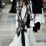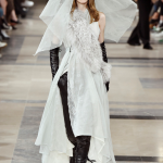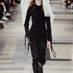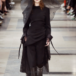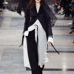 Evocativa la collezione di Ann Demeulemeester, protagonista della settimana della moda di Parigi: la musa del brand per la prossima stagione invernale è una sposa fantasma, che sfoggia il più classico dei capi da matrimonio, il velo, calato sull’incarnato eburneo e sulle labbra scure. Sulle note di un remix di “All Tomorrow’s Parties” sfilano figure oniriche dal fascino tragico, che ricordano le roine di Jane Austen: un lato oscuro da dark lady si unisce a suggestioni virginali, aprendo scenari post-apocalittici dal grande impatto scenografico. Femminista e ribelle, minimale e struggente, la donna immaginata da Sebastien Meunier “sogna l’amore futuro, sogna di accasarsi ma anche di restare libera… e sogna di fare festa”. In un mix di ispirazioni eterogenee, sfila una parata di top model tra cui spiccano Erin O’Connor, Kirsten Owen e Alek Wek. Non mancano inedite note sportswear e veli da donna devota, che impreziosiscono quasi tutte le uscite. Pizzo e velluto prezioso dominano, in alternanza alla pelle nera dal piglio strong; un po’ dark lady e un po’ femme fatale, la sposa cadavere sembra acquisire nuova vita attraverso le note della soundtrack, che evocano party all’ultimo grido, a smitizzare le note post-apocalittiche di cui sembra essere intrisa la collezione. Largo a tocchi fur e decorazioni audaci, su capi dall’aspetto invecchiato. Poetica e suggestiva, la donna che calca la passerella non lesina in tocchi fetish nei capispalla in pelle all over, con punto vita enfatizzato da cinture.