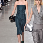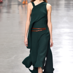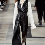 Atmosfere monastiche si alternano a note workwear sulla passerella di Lemaire: Christophe Lemaire e Sarah-Linh Tran gettano le basi di una estetica nuova, che intende violare deliberatamente i diktat imperanti: dimenticate il dress code professionale, che qui si arricchisce di spunti inediti, in perenne bilico tra meditazione malinconica e suggestioni timeless. La musa a cui il duo di stilisti si ispira è una fashionista, ristretta entro gli angusti confini di un ufficio: cosa indosserebbe una it girl contemporanea se si trovasse dietro la scrivania? Questo il sunto da cui il duo creativo parte, in una riflessione tutt’altro che banale, che intende anche coniugare le molteplici correnti della moda attuale, dalle ardite sovrapposizioni tipiche dello streetwear alle note sporty-chic fino allo charme evergreen dei capi sartoriali, protagonisti del défilé. La sfilata si apre con uno shirt dress in lana nera con austero colletto bon ton e maniche extra long: domina quindi una classicità dal piglio sartoriale, che trascende i confini fino a toccare vette inusitate, che strizzano l’occhio a certo conservatorismo. Gonne al ginocchio si alternano a cappotti oversize, tra colli alti dal piglio esistenzialista e tripudio di velluto a coste. Largo a blazer senza collo in grigio, tra proporzioni angolari che enfatizzano la silhouette. Il duo creativo addolcisce il mood imperante attraverso tocchi più femminili, come in certe tuniche e nei blouson da indossare con gonna a tubo. Non mancano inediti coup-de-theatre, come la blusa con rouches in suede gigio da indossare con cargo pants, o le sete preziose declinate su gonne e bluse che divengono i nuovi abitini da cocktail.