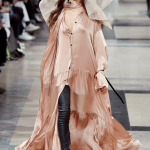 Un ottimismo in chiave psichedelica ispira a Clare Waight Keller la sua ultima collezione come direttore creativo di Chloé: un addio che porterà la stilista al timone di Givenchy, come reso noto proprio qualche giorno fa. Tra pragmatismo e tocchi di leggiadra femminilità sfila l’ultima collezione della Keller, sulle note di un ottimismo psichedelico. Dopo sei anni alla guida del brand, la designer punta al topos dell’evasione dalla realtà: una fuga da realizzarsi attraverso la moda, che diviene veicolo privilegiato per affrontare le difficoltà del mondo. Clare Waight Keller si pone come interprete delle emozioni della gente comune, che avverte sempre più impellente il bisogno di evadere da un mondo spesso difficile. Largo a pattern iconici, che conferiscono alle varie mise un input ottimista: che si tratti di stampe e tocchi fur, si parte da un approccio retrospettivo, che guarda al passato, senza nulla togliere alla musa di Chloé, da sempre incarnazione emblematica di certo stile effortlessy-chic à la parisienne. L’allure boho è tutta qui, anche se stemperata dal piglio bon ton di morbidi fur coat, che sembrano strizzare l’occhio più a note ladylike che alla grinta bohémien. Non mancano ispirazioni Sixties, tra bluse languide e abiti in pizzo. Largo a maglioni multicolor e note tailoring nelle giacche e nei cappotti in shirling. Le silhouette sono morbide e fluide, sia per tute intere che per due pezzi. Stampe cachemire e paisley di ispirazione Seventies impreziosiscono camicette bon ton con fiocco, da indossare con chemisier irriverenti in vinile dalle linee a trapezio; la morbidezza dei cappottini in pelliccia si unisce alla femminilità delle cinture con fiocco, che cingono la vita; non mancano colletti alla collegiale e stampe patchwork in chiave dévoré, per blouson sporty-chic. I pantaloni cargo vengono ora declinati in blocchi bicromatici e si indossano con felpe dalle tinte fluo, in un omaggio allo streetwear di ispirazione sporty.