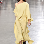 Ritorno alle origini per Guy Laroche, che porta sulla passerella del prêt-à-porter parigino una collezione basata sull’estetica primigenia del brand. L’idea di eleganza classica da sempre prediletta dal brand si unisce alle note inedite di un sex appeal privo però di reali risvolti: adottando un’ottica unisex, si sfoglia ora nell’archivio del brand, citando due foto storiche, raffiguranti l’una una donna strizzata in un maxi dress in crepe di seta e l’altra un fur coat colorato. Si tratta di due uscite tratte da due collezioni couture risalenti ai primi anni Settanta: “L’uso della sessualità come base dell’eleganza”, questo il monito da cui si parte in un excursus affascinante attraverso lo stile di Guy Laroche. Adam Andrascik apre il défilé con una giacca blu impreziosita da due bande in pelliccia che si estendono dal colletto attraverso spirali che circondano la silhouette. Risulta forse un po’ ripetitivo il continuo gioco di flash-back rispetto al passato: ma potenti le silhouette slim si alternano ad abiti con scollo a v, tra crepe di seta asimmetrica declinata nei toni del turchese, del fucsia e del giallo lime. Non mancano combinazioni ardite ed eclettiche, tra decorazioni multicolor e sartorialità nei capispalla. Impalpabili ed eterei certi abitini, alternati a bluse dalle profonde scollature, da indossare con blouson e pantaloni sartoriali a vita alta; audaci accostamenti cromatici caratterizzano molte delle uscite, tra scollature stile Bardot e gonne svolazzanti. Un mix di femminilità brada e note mannish caratterizza i lunghi abiti black smorzati da montoni in chiave mini, mentre fasce bustier nere strizzano il punto vita di chemisier fucsia. Caleidoscopica ed affascinante, la collezione spazia attraverso numerose ispirazioni, che hanno reso il brand iconico. Il capo principe della sfilata è la giacca impreziosita da stola in pelliccia a contrasto, da indossare su pantaloni ampi decorati finemente.