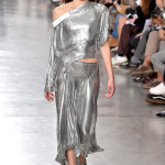 Aggressiva e sensuale la donna Isabel Marant è protagonista assoluta della settimana della moda parigina, in una sfilata pervasa da note Eighties: come una valchiria metropolitana, la musa della stilista percorre con falcate sicure la passerella, sfoggiando capi dal sapore boho-chic. Come una diva patinata, con tanto di spalline over, la vediamo indossare tailleur di netta ispirazione anni Ottanta, che ricordano le atmosfere di Dynasty, e lo stile iconico dei personaggi interpretati da Joan Collins. Tuttavia il mood viene sapientemente smorzato da tocchi bohémien dal forte impatto scenografico, che cedono talvolta il posto a tocchi folcloristici, declinati in chiave luxury. Tripudio di giacche e top in velluto, tra capispalla e blazer sartoriali e lunghi abiti impreziositi da cinture in suede. Le silhouette sono fluide e femminili, tra giochi di sete plissé che decorano lunghe gonne dalle suggestioni Seventies da indossare con stivali e cuissard. Camaleontica e pratica, la collezione intende interpretare gli innumerevoli modi in cui si possono indossare capi timeless, che travalicano la mera stagionalità, senza perdere di vista un senso di comfort e stile. Le lunghezze diventano importanti e i materiali usati prediligono tessuti caldi e morbidi, per affrontare al meglio il rigore invernale. Potente e sensuale, la donna di Isabel Marant ostenta una sfrontata femminilità, che trova concreta rappresentazione nei jeans impreziositi da cristalli, negli abitini animalier e negli stivali glitterati. Tripudio di denim e note rock, tra smoking oversize indossati con camicia sbottonata e abitini argentati dai riflessi siderali: scanzonata ed eclettica, la musa di Marant ha il volto di supermodelle del calibro di Amber Valletta, mirabili interpreti di uno stile iconico.